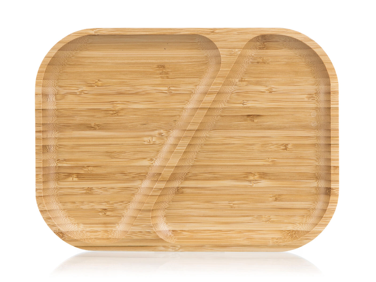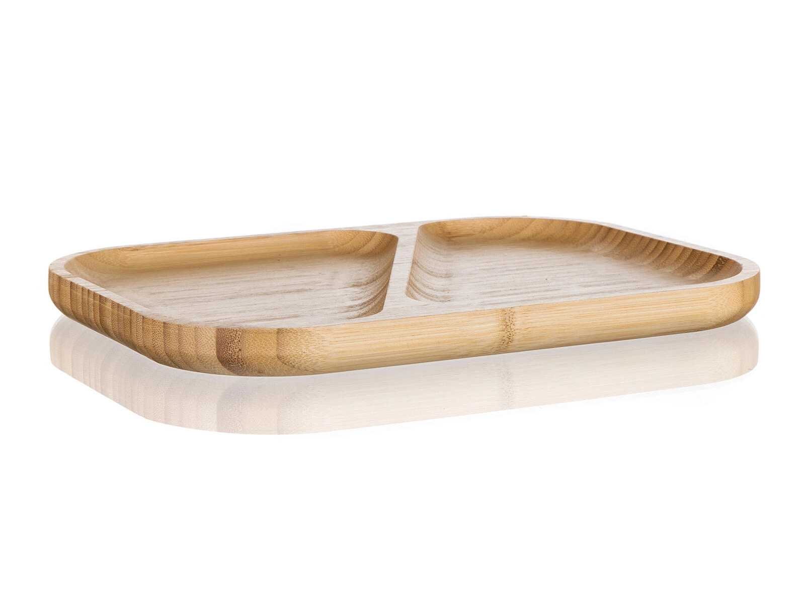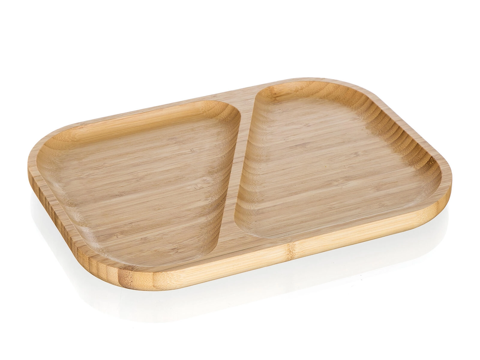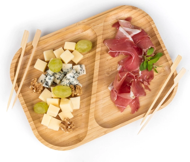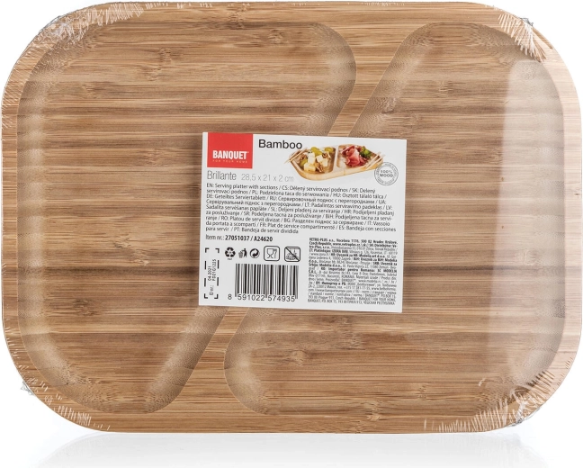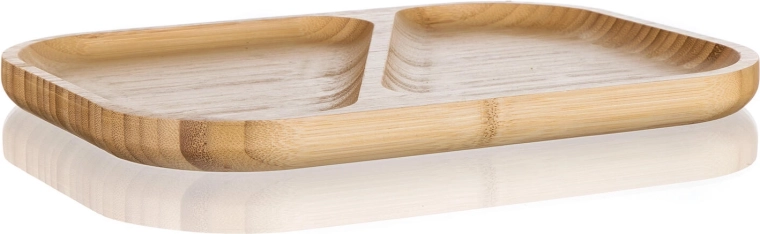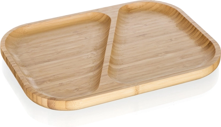 Elegante bamboe serveerschaal met verdeelde secties voor overzichtelijk serveren van zowel hartige als zoete lekkernijen. Dankzij het natuurlijke bamboehout, de twee aparte vakken en de praktisch afgeronde randen blijft alles op zijn plaats en voeg je stijl toe aan de tafel.