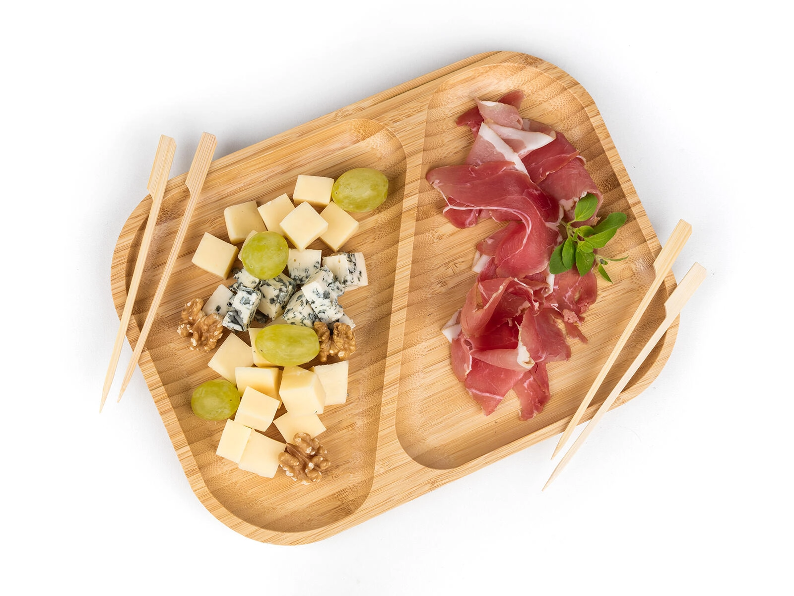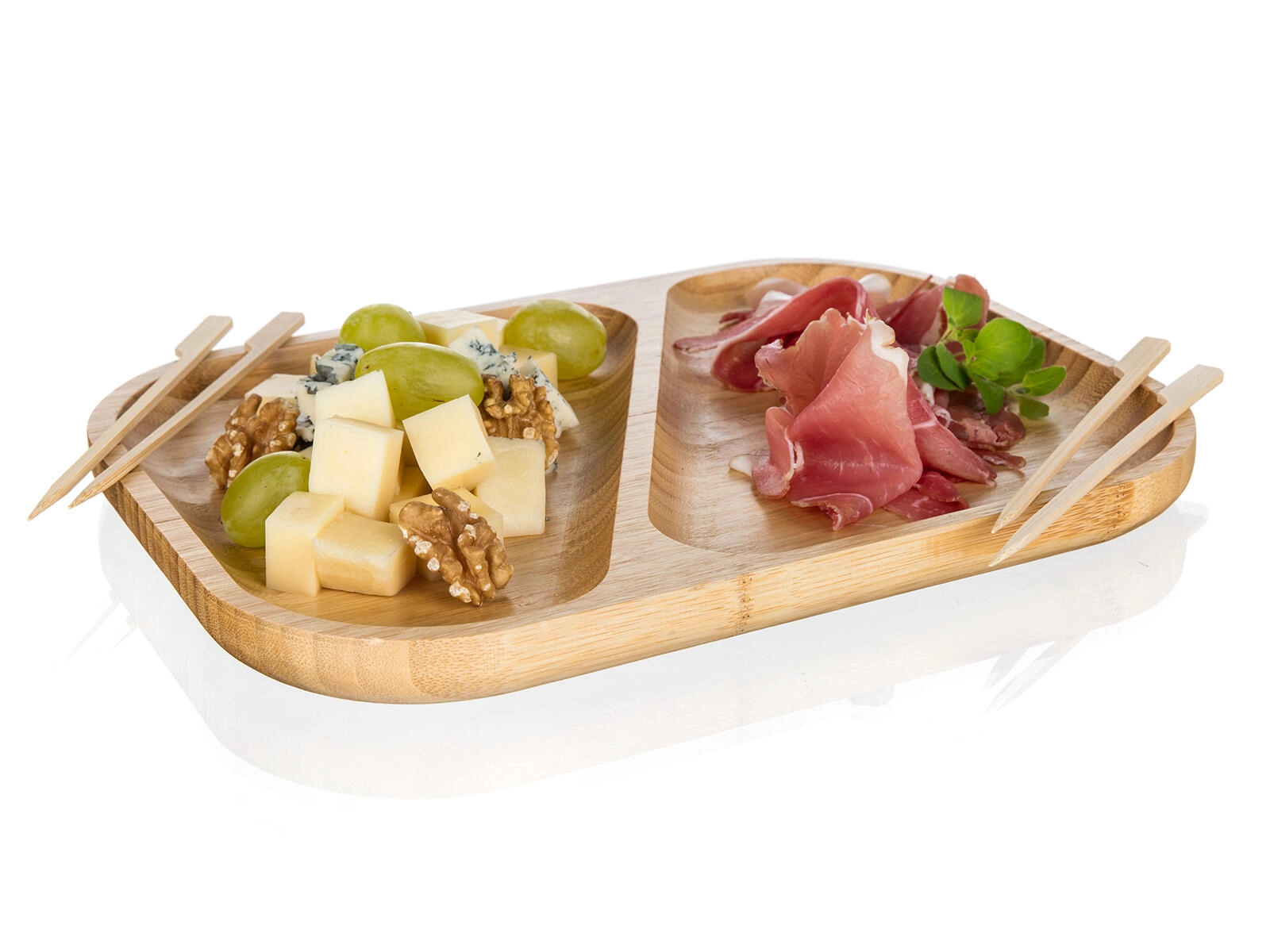 Twee gescheiden vakken houden smaken en texturen uit elkaar – perfect voor kazen, vleeswaren, noten en fruit op één schaal.