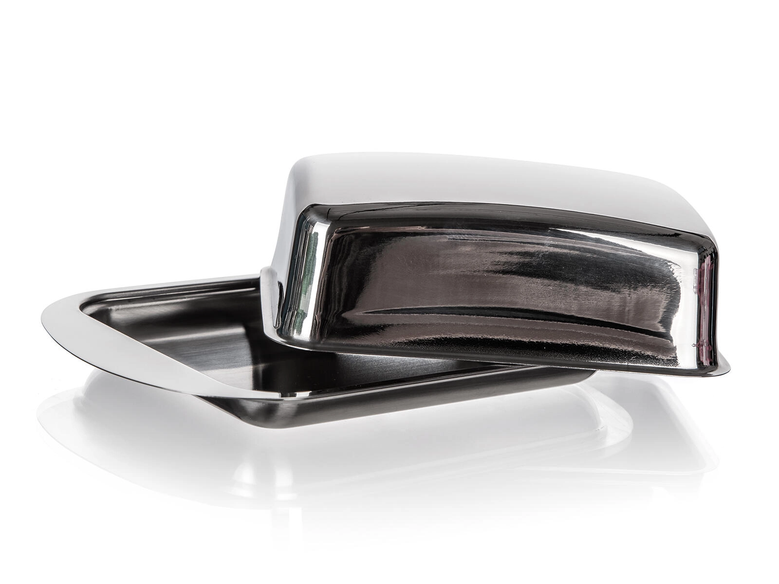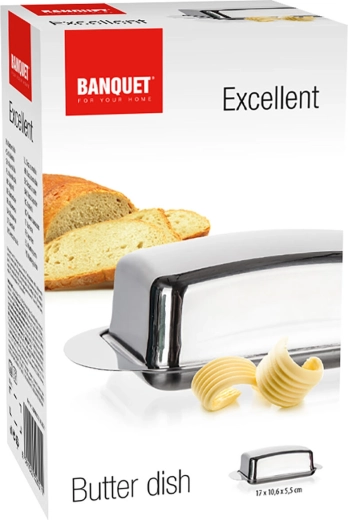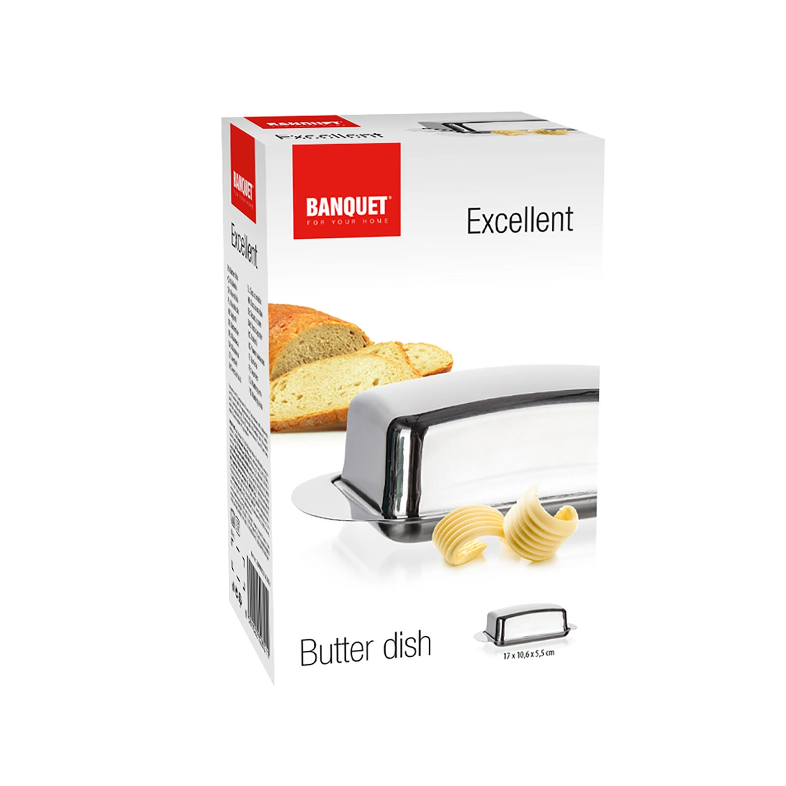 De elegante RVS boterschaal EXCELLENT houdt boter langer vers en altijd klaar om te serveren. De duurzame constructie van roestvrij staal, het praktische deksel tegen vuil en de afmetingen voor een standaard pakje boter maken dit tot een ideale aanvulling voor zowel de eettafel als het aanrecht.