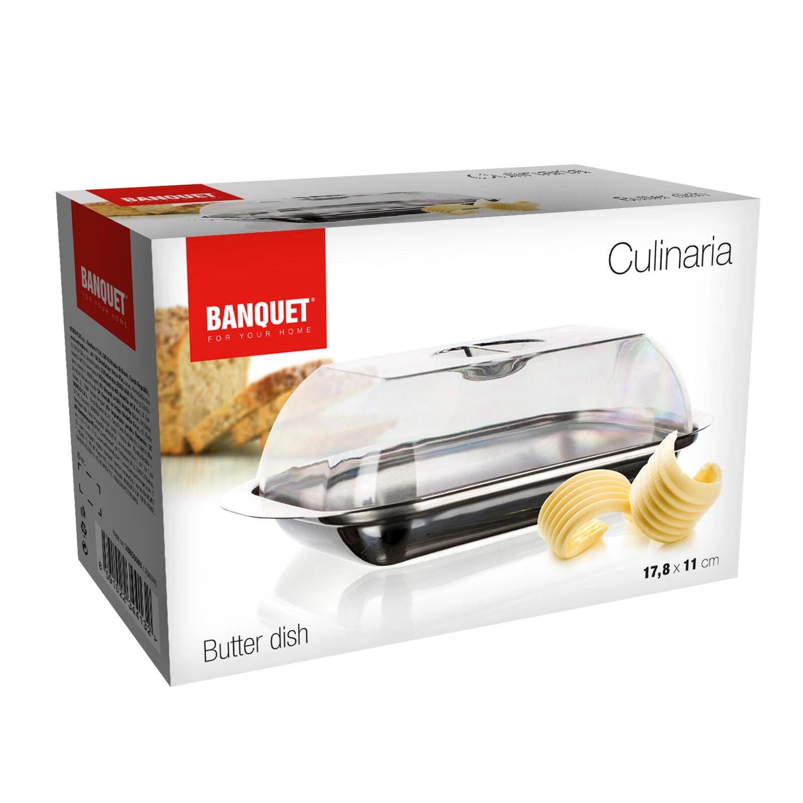 Bewaar boter hygiënisch en met elegantie. De CULINARIA-boterdoos combineert duurzaam roestvrij staal met een transparant plastic deksel, waardoor u altijd zicht hebt op de inhoud. Het ideale formaat past gemakkelijk op een koelkastplank en op de ontbijttafel.