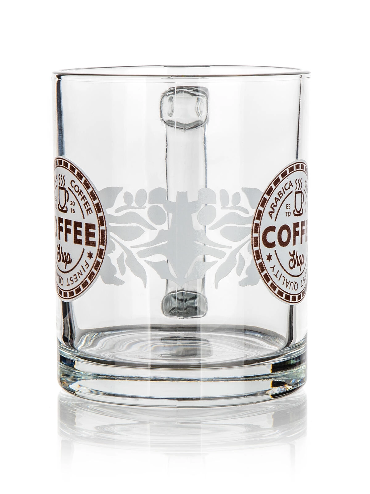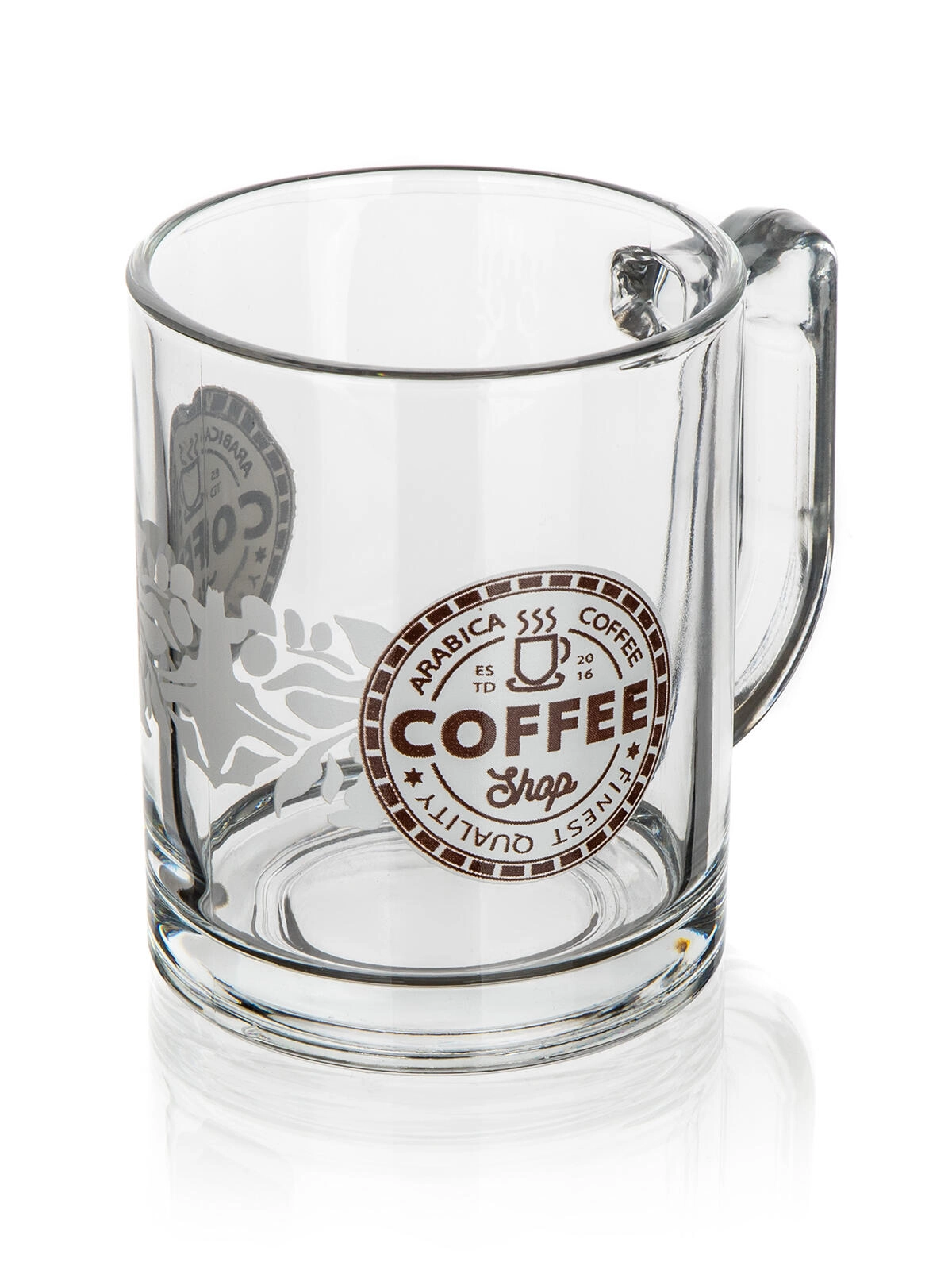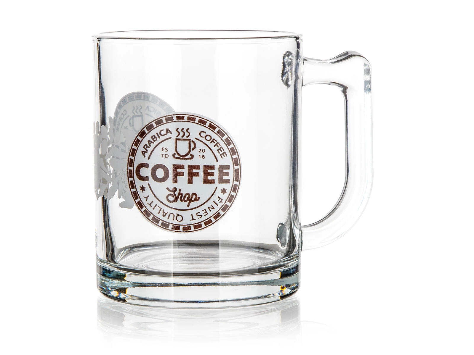 Elegante glazen mok met een inhoud van 345 ml en het decor “Coffee Shop/Arabica”, ideaal voor dagelijks gebruik. Dankzij het transparante glas, het robuuste oor en de dikke bodem serveer je comfortabel warme en koude dranken – van koffie en thee tot latte of huisgemaakte limonade.
