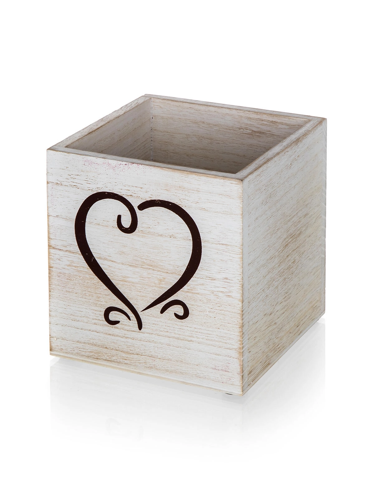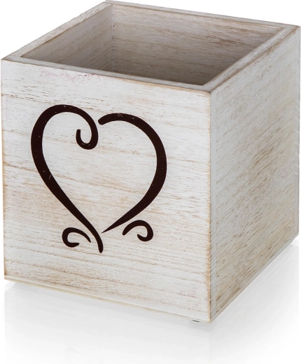 Stijlvolle houten doos met witte patina en hartmotief die je huis een rustieke charme geeft. Ideaal als decoratie, pennenhouder of mini bloempot voor droogbloemen. Dankzij de stabiele beschermvoetjes beschermt hij oppervlakken en de stevige constructie zorgt voor een lange levensduur.