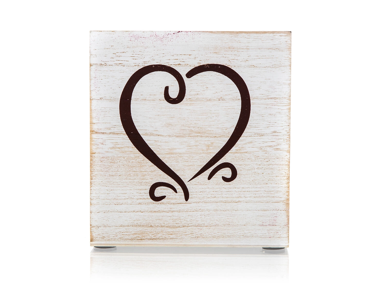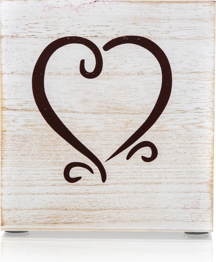 De witte patina en het subtiele hartmotief geven elke plank of werktafel een knusse, huiselijke uitstraling.