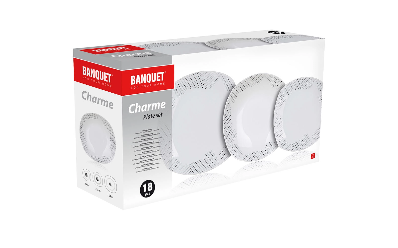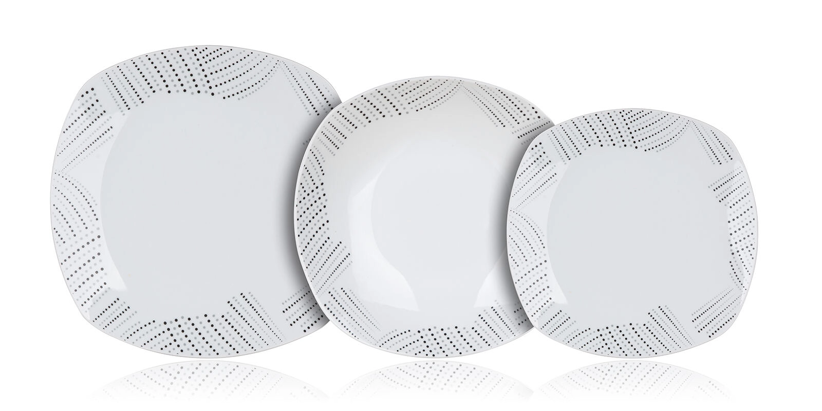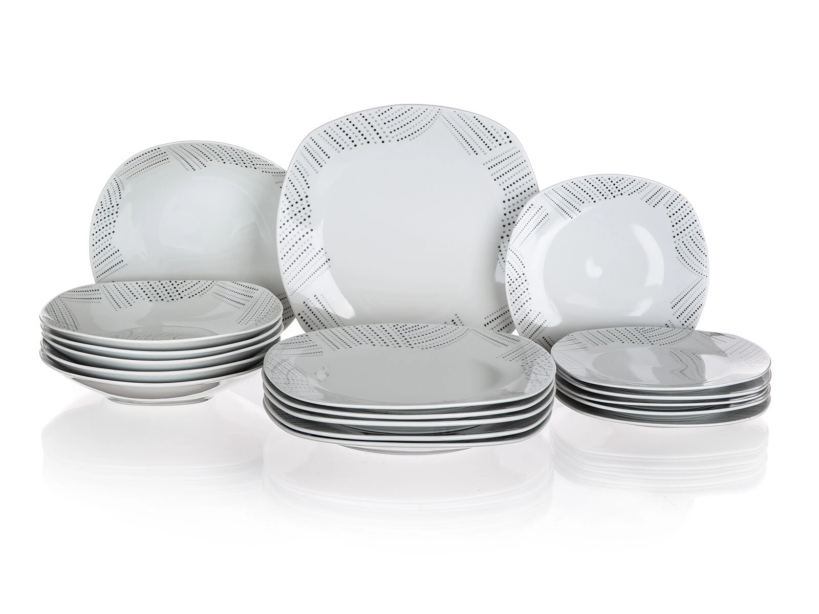 Elegant porseleinen dinerservies BANQUET Charme Square voor 6 personen met een modern design, vierkante vorm met afgeronde hoeken en een subtiel gestippeld patroon langs de randen. Geschikt voor de vaatwasser en de magnetron, ideaal voor dagelijks gebruik én feestelijke gelegenheden.