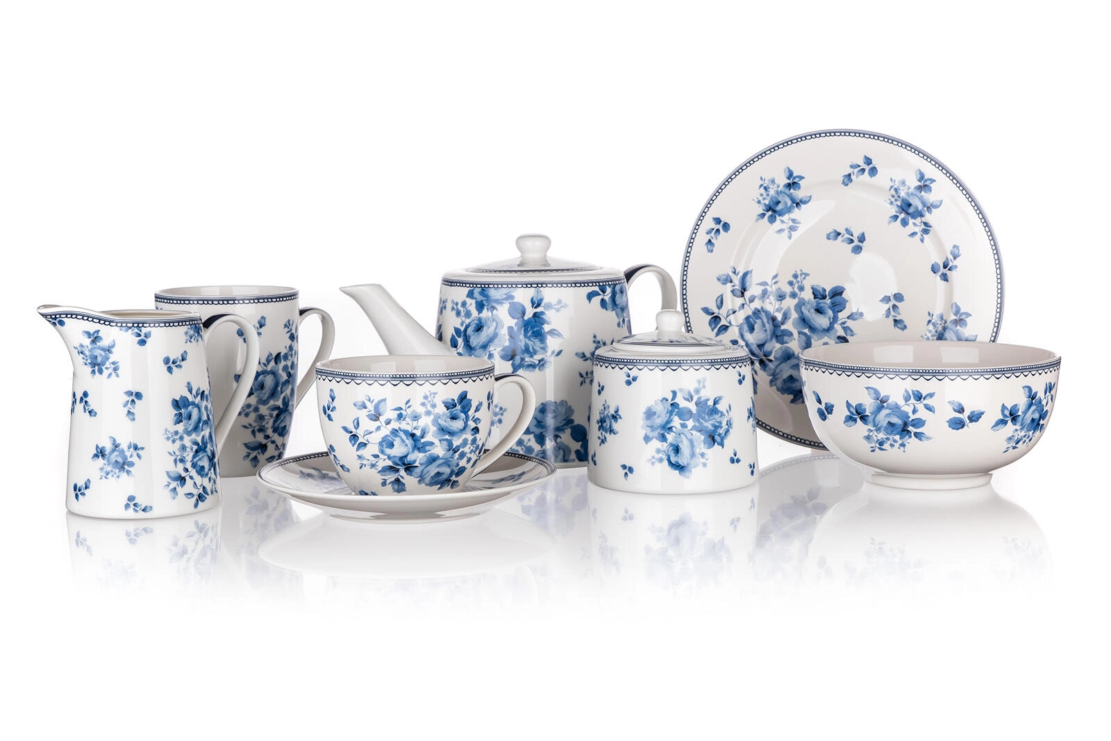Witte glazuur met blauw floraal decor Blue Flower oogt elegant en laat zich gemakkelijk combineren met ander servies en een feestelijk gedekte tafel.
