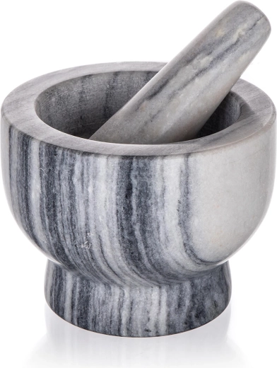 De vijzel is perfect voor het maken van pesto, pasta’s en kruidenmengsels. Dankzij de tijdloze marmerlook past hij in elke keuken en wordt hij zowel een praktische helper als een decoratief element op het werkblad.