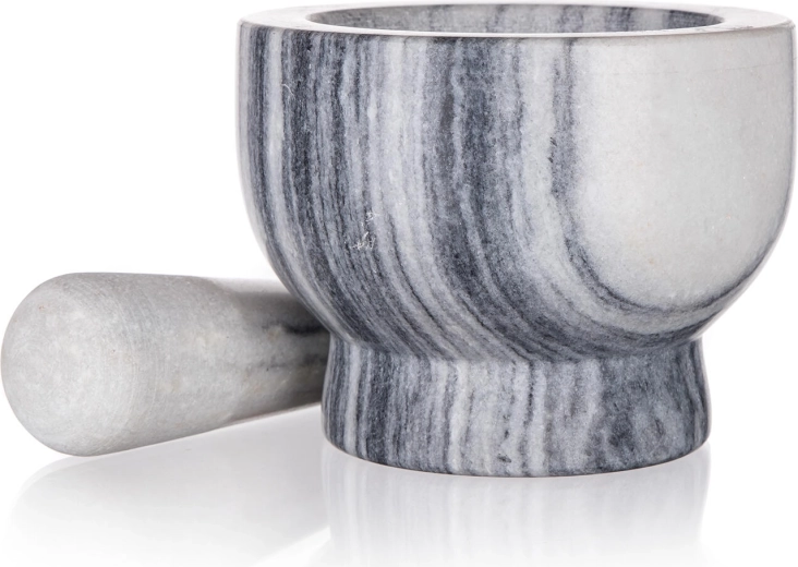 Elegante marmeren vijzel Culinaria met een diameter van 13 cm en een robuuste stamper, ideaal voor het pletten van specerijen, kruiden en het maken van verse pesto. Dankzij de zware stenen constructie biedt hij stabiliteit en efficiënt malen, terwijl het natuurlijke marmer met subtiele adering een stijlvolle blikvanger in de keuken is.