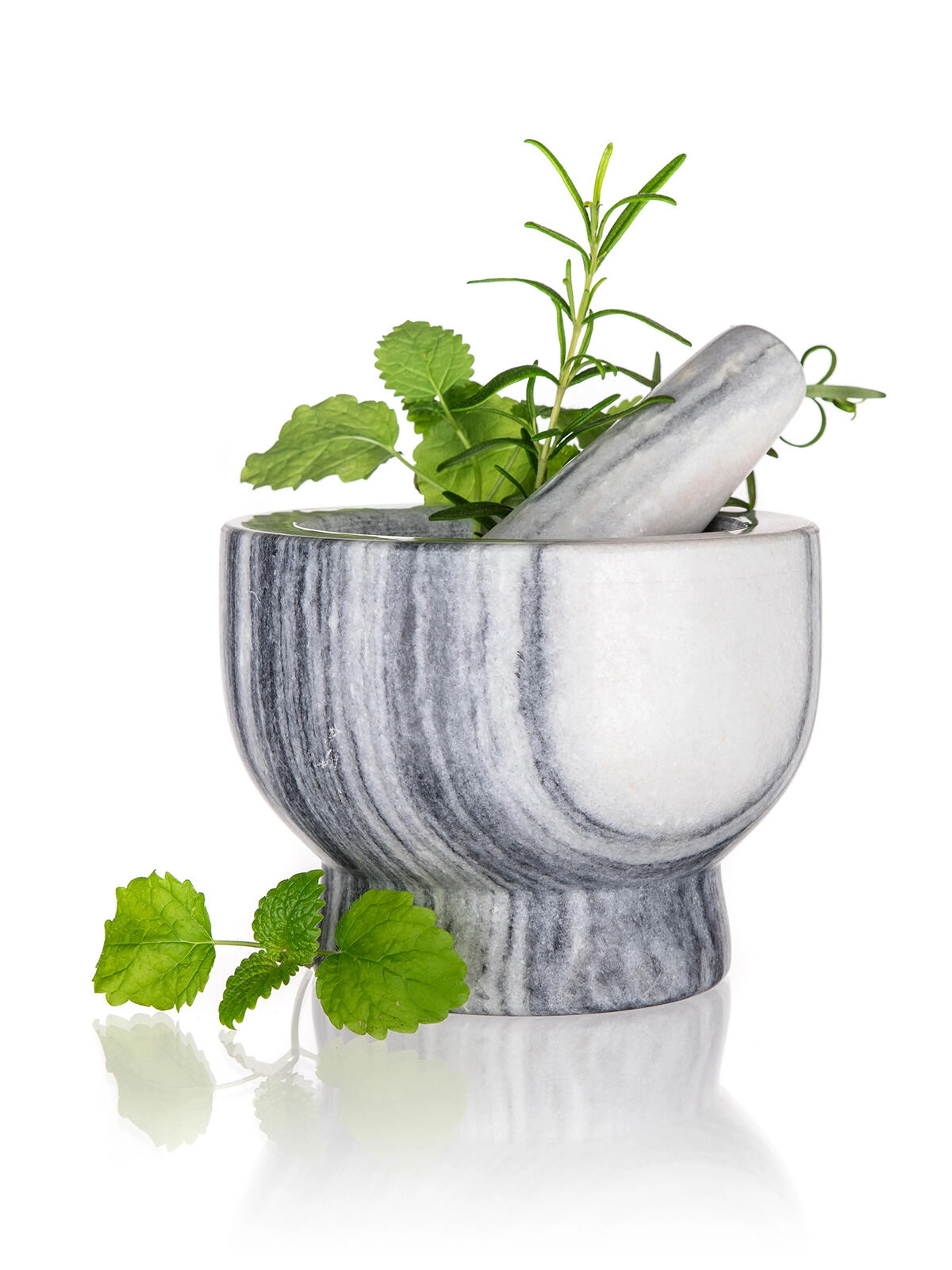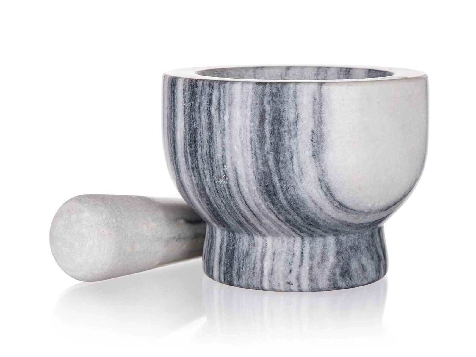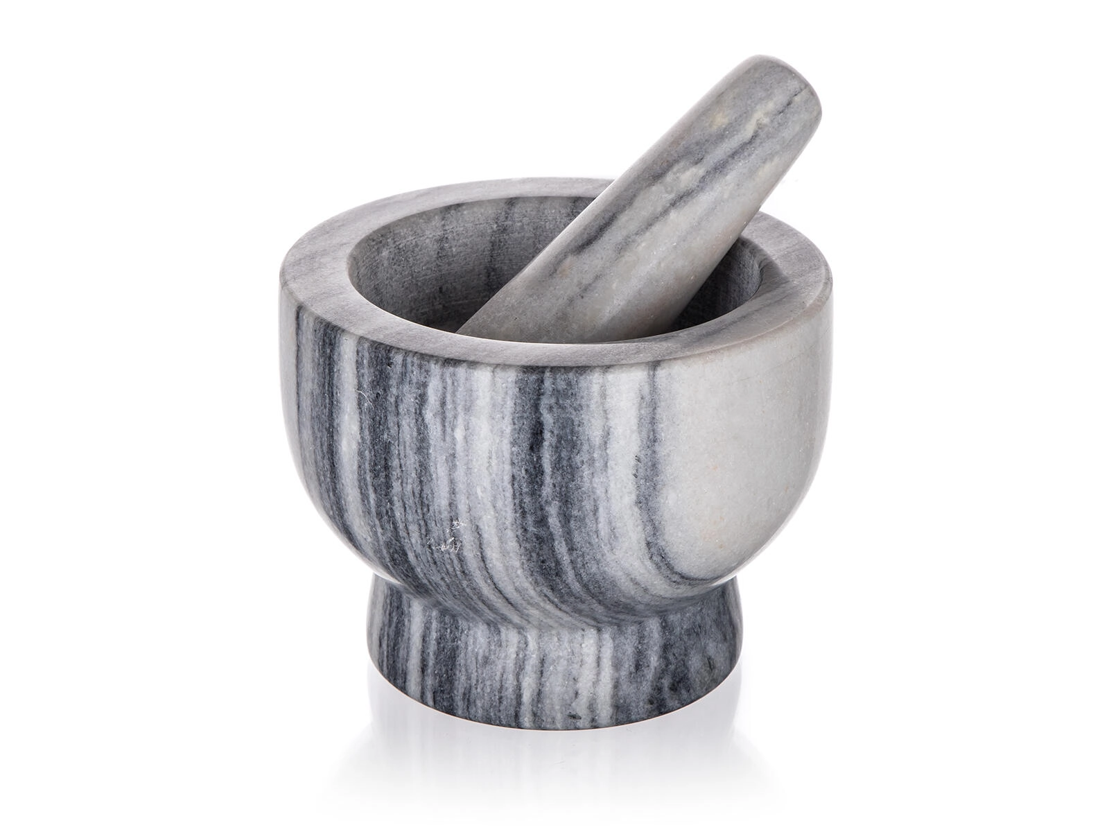 De natuurlijke adering van het marmer maakt van de vijzel niet alleen een praktisch hulpmiddel, maar ook een elegante decoratie op het aanrecht.