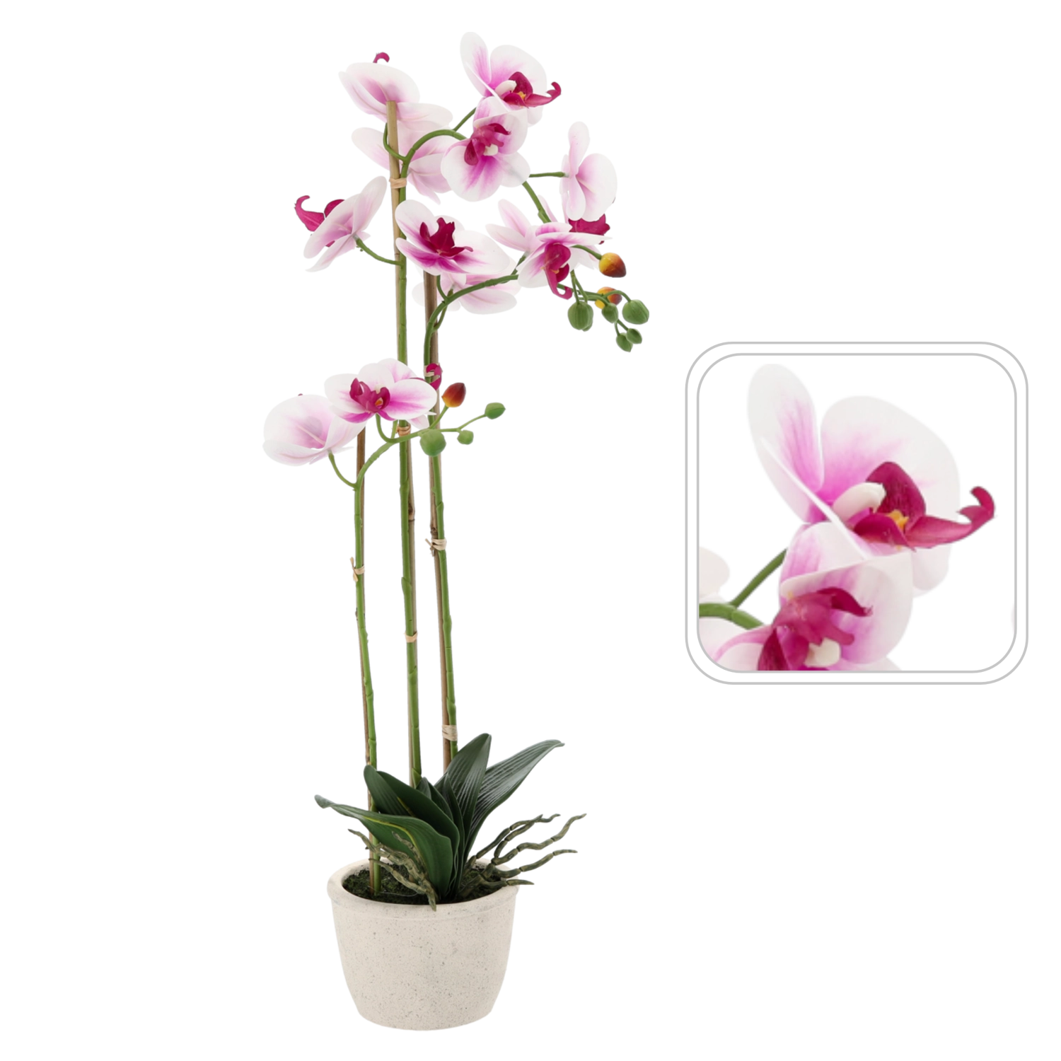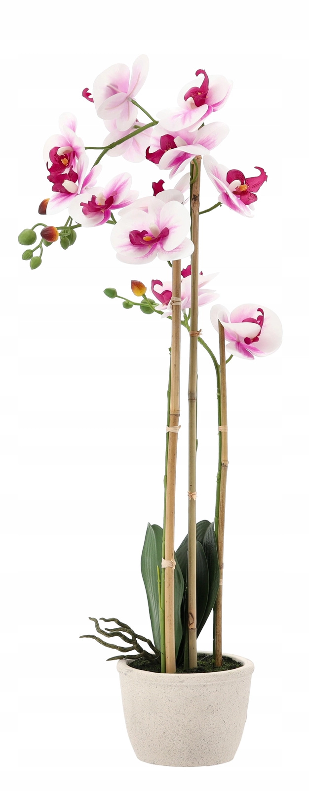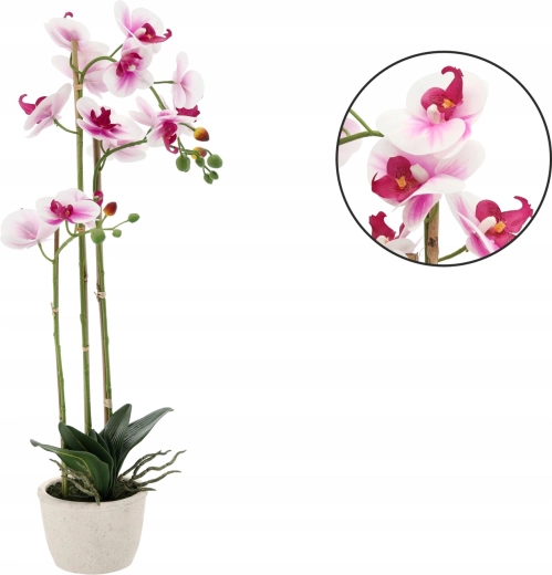 Deze elegante kunstorchidee in een zachte wit‑roze kleurstelling oogt zeer natuurlijk dankzij de fijn afgewerkte bloemen, knoppen en bladeren. De hoogte van 70 cm is ideaal voor vensterbanken, dressoirs of badkamers en brengt frisheid en stijl zonder behoefte aan licht of regelmatig onderhoud.