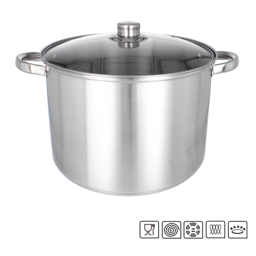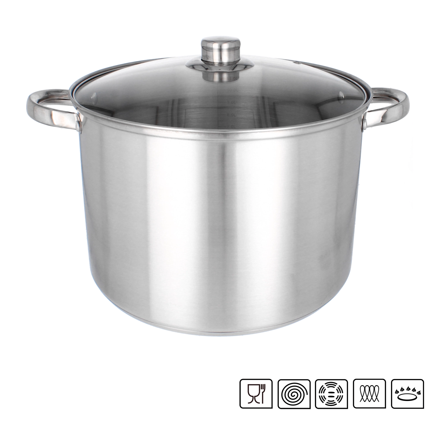 Robuuste roestvrijstalen pan met een inhoud van 14 l en een diameter van 30 cm, voorzien van een inductiegeschikte meerlaagse bodem voor snelle en gelijkmatige verwarming. Gemaakt van staal S/S 201 met een dikte van 0,5 mm, biedt hij een hoge corrosiebestendigheid en een lange levensduur. Inclusief glazen deksel, stevige roestvrijstalen handgrepen en een praktische interne maatverdeling voor eenvoudig doseren.