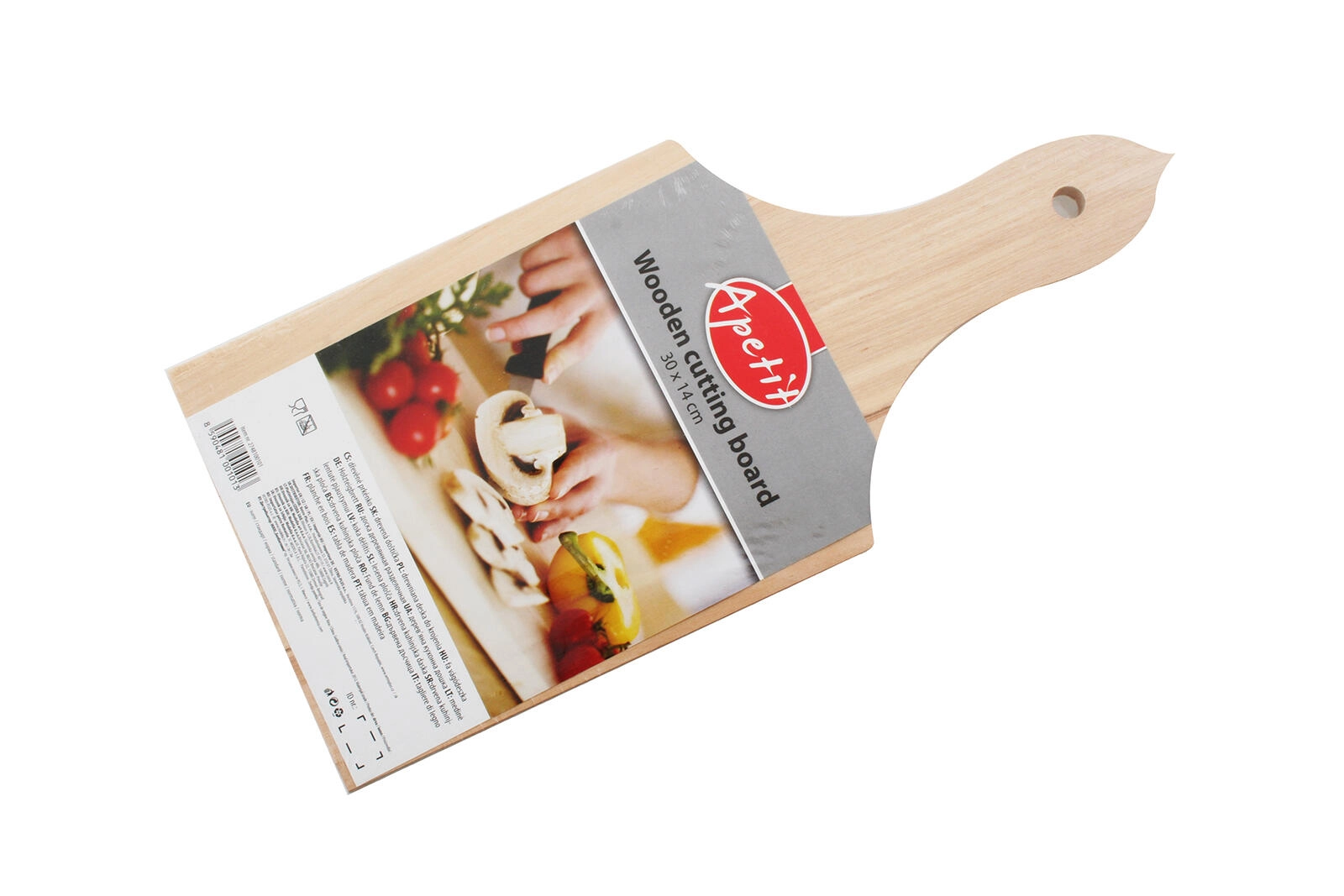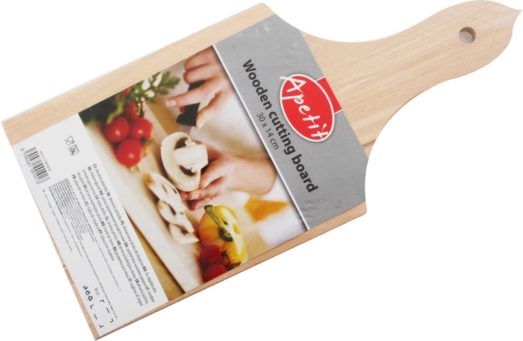 Praktische houten snijplank APETIT met afmetingen 30 × 14 cm in een natuurlijke uitvoering zonder oppervlaktebehandeling. Biedt een stabiel oppervlak om te snijden en te serveren, heeft een geboorde handgreep voor eenvoudig ophangen en een natuurlijke houtlook die in elke keuken past.