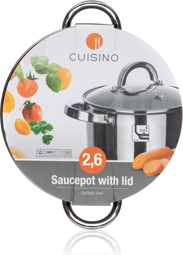 Praktische roestvrijstalen pan CUISINO met een inhoud van 2,6 l en een diameter van 18 cm met glazen deksel is ideaal voor dagelijks koken. Biedt een glanzend oppervlak aan binnen- en buitenzijde, een interne maatverdeling voor nauwkeurig doseren en stevige RVS handgrepen en knop. Geschikt voor alle soorten kookplaten en wordt een betrouwbare hulp in uw keuken.