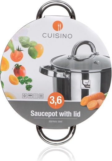 Praktische roestvrijstalen pan CUISINO met een inhoud van 3,6 l en een diameter van 20 cm, voorzien van een glazen deksel, ideaal voor dagelijks koken. Biedt een glanzend binnen- en buitenoppervlak, een interne maatverdeling voor eenvoudig afmeten en stevige RVS handgrepen. Geschikt voor alle soorten kookplaten en perfect voor het bereiden van soepen, sauzen en bijgerechten.