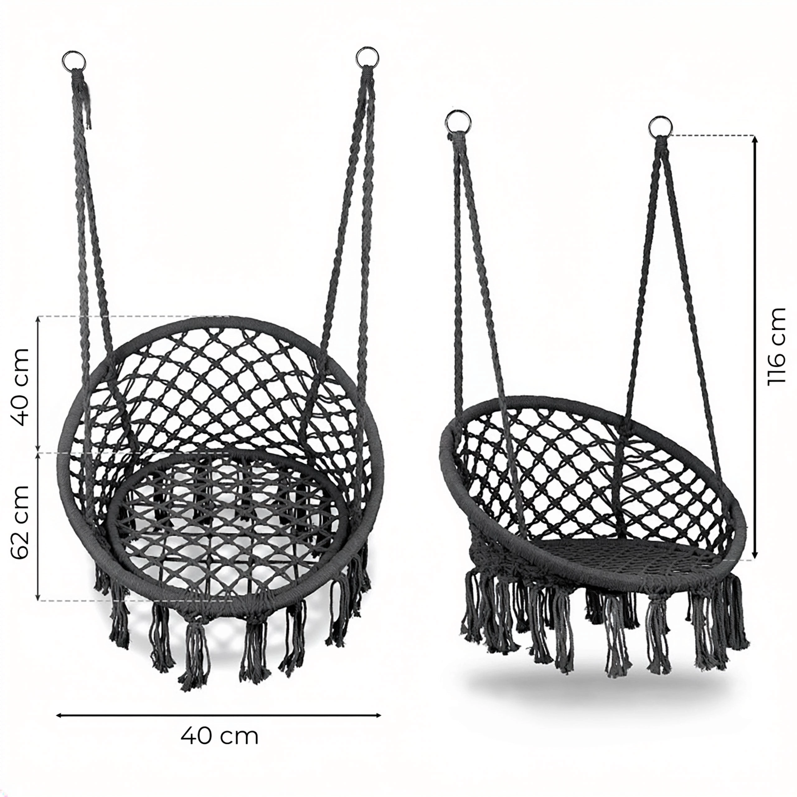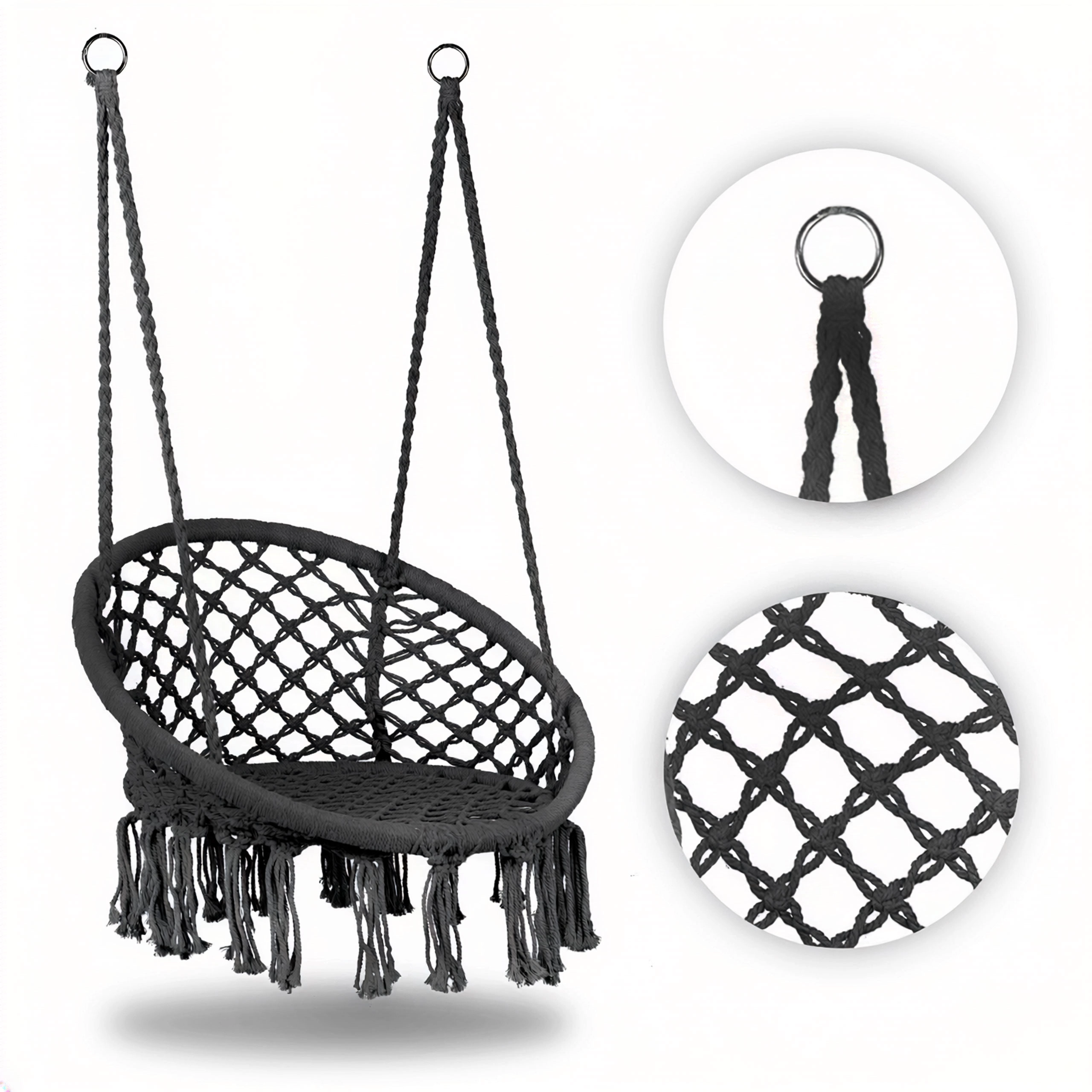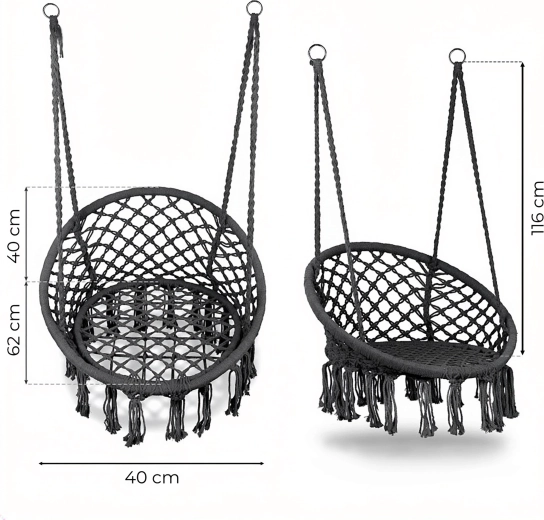 Creëer je eigen relaxzone binnen en buiten met deze stijlvolle hangstoel in bohostijl. Het stevige stalen frame van 22 mm, het duurzame touwvlechtwerk van 3 mm en de keuze voor enkel- of dubbelpuntsophanging zorgen voor comfort en veiligheid. Het soepele zachte schommelen ontspant lichaam en geest, terwijl de draagkracht van 120 kg ideaal is voor dagelijks gebruik op het terras, balkon of in de woonkamer.