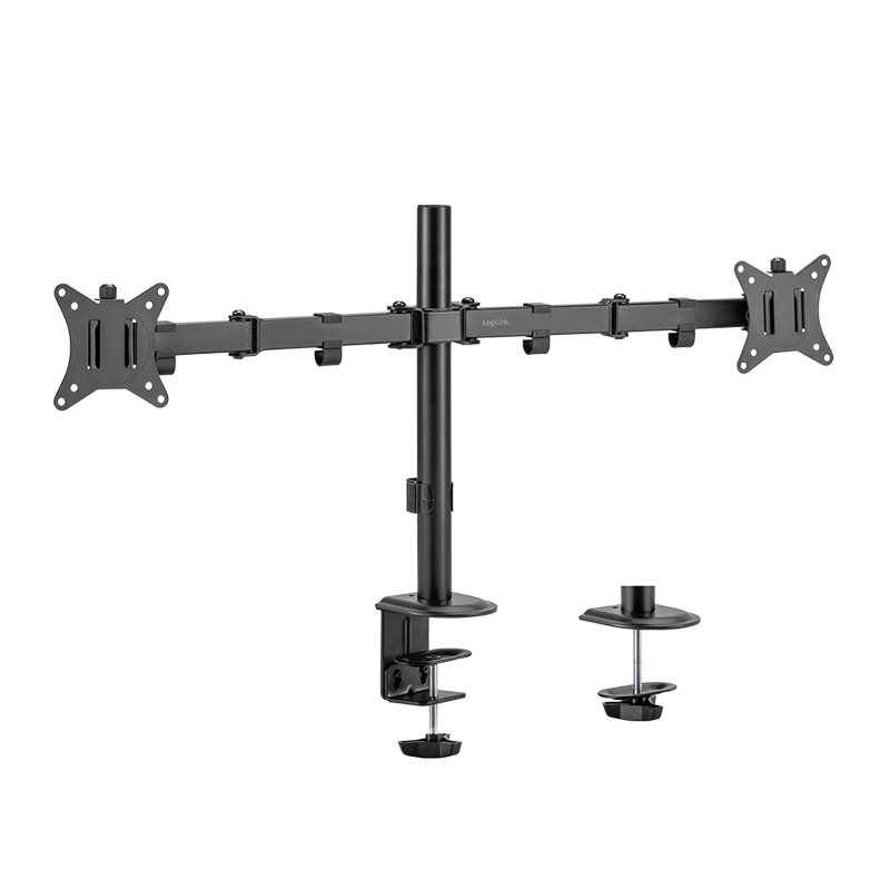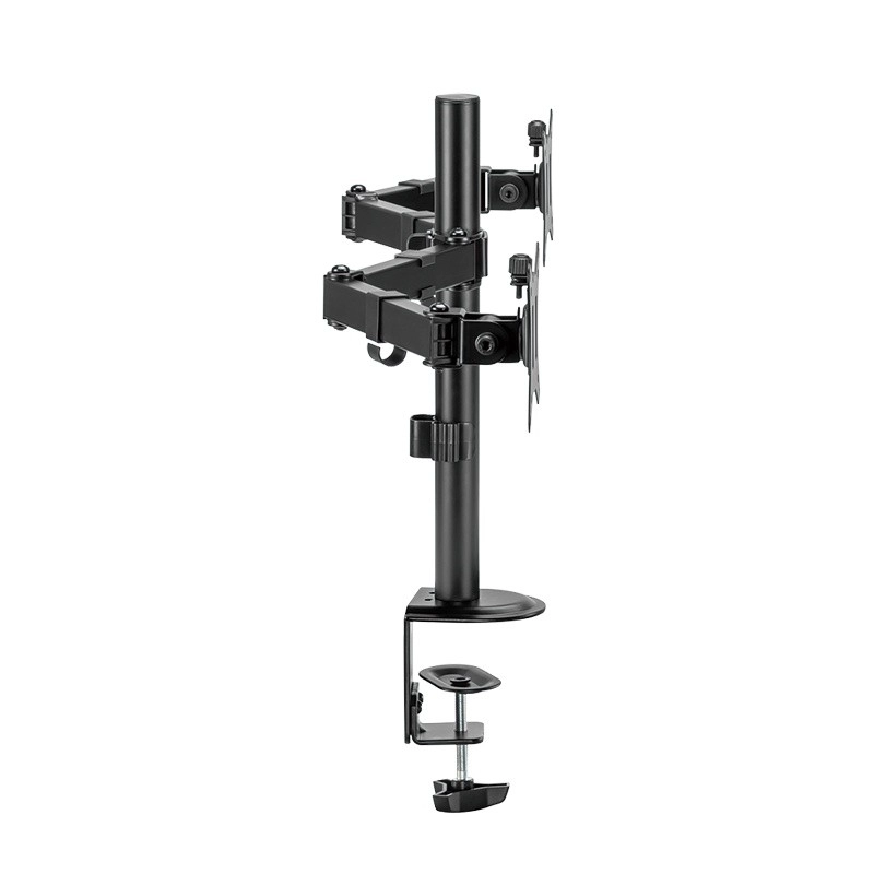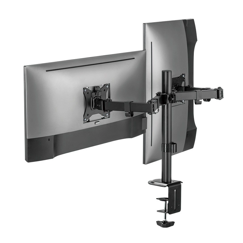 Maak bureauruimte vrij en creëer een ergonomische werkplek met deze universele houder voor twee monitoren van 17–32". Biedt soepele hoogteverstelling, kantelen, draaien en rotatie naar portret/landschap, zodat je eenvoudig de ideale positie van je schermen instelt. De robuuste constructie met een draagvermogen van 2×9 kg en bevestiging met een klem aan het bureaublad zorgt voor een stabiele en veilige montage.