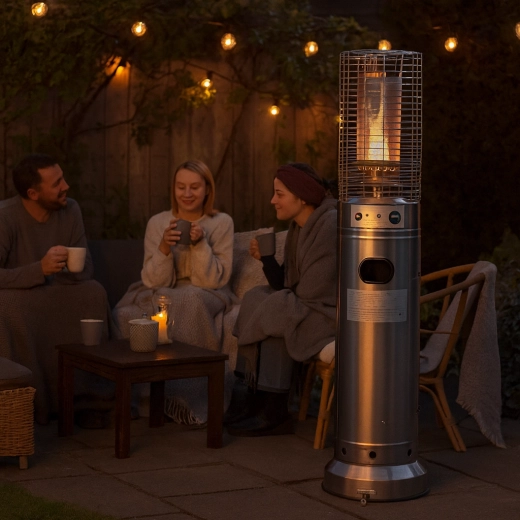 De hoogte van 136 cm bespaart ruimte op kleinere terrassen en balkons, terwijl de verwarmer toch krachtige stralingswarmte levert voor comfort op koelere avonden.