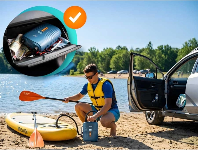 Steek hem in de sigarettenaansteker en pomp overal onderweg. De uitblaasmodus versnelt het inpakken na een dag op het water.