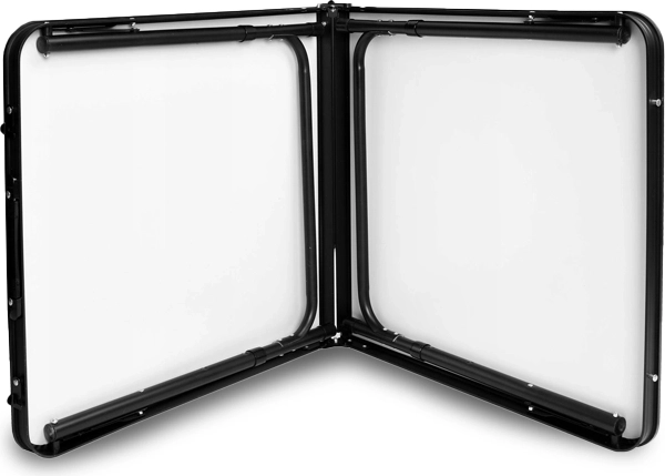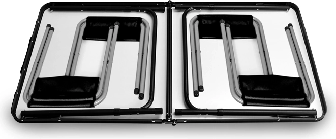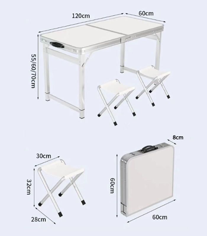 Ingevouwen heeft alles de vorm van een koffertje van 60 × 60 × 8 cm met een gewicht van slechts 6,55 kg, waardoor het eenvoudig is te dragen en op te bergen in auto of huis. De tafel biedt een afmeting van 120 × 60 cm en een verstelbare hoogte van 55/60/70 cm voor comfortabel dineren voor kinderen en volwassenen. De krukjes met metalen constructie zijn direct klaar voor gebruik.