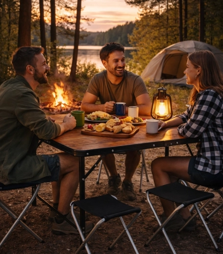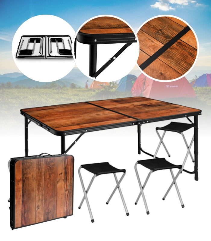 Deze veelzijdige opvouwbare 5-in-1 set combineert draagbaarheid en stabiliteit. Dankzij het duurzame metalen frame en betrouwbare vergrendelingen is de tafel stevig, terwijl de vier opvouwbare krukjes snel en comfortabel zit bieden. Het design in houtdecor past bij de natuur en het terras, ideaal voor kamperen, tuinset-ups en picknicks aan het meer.