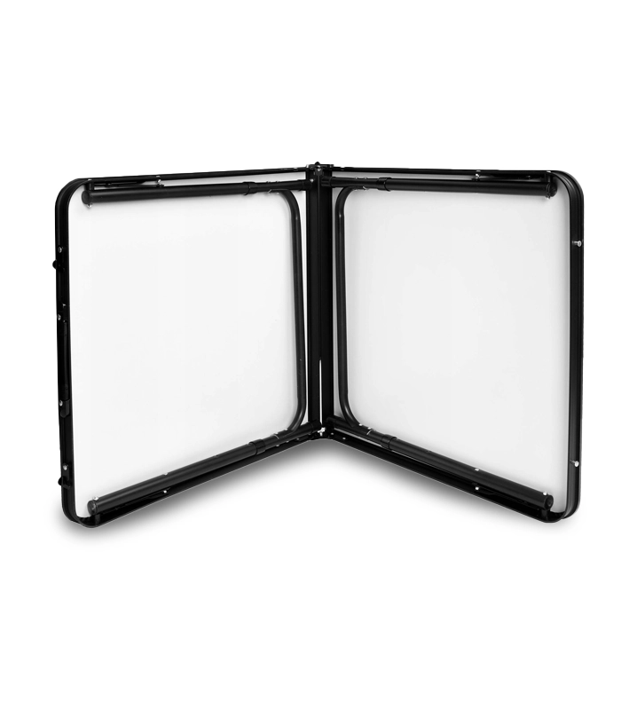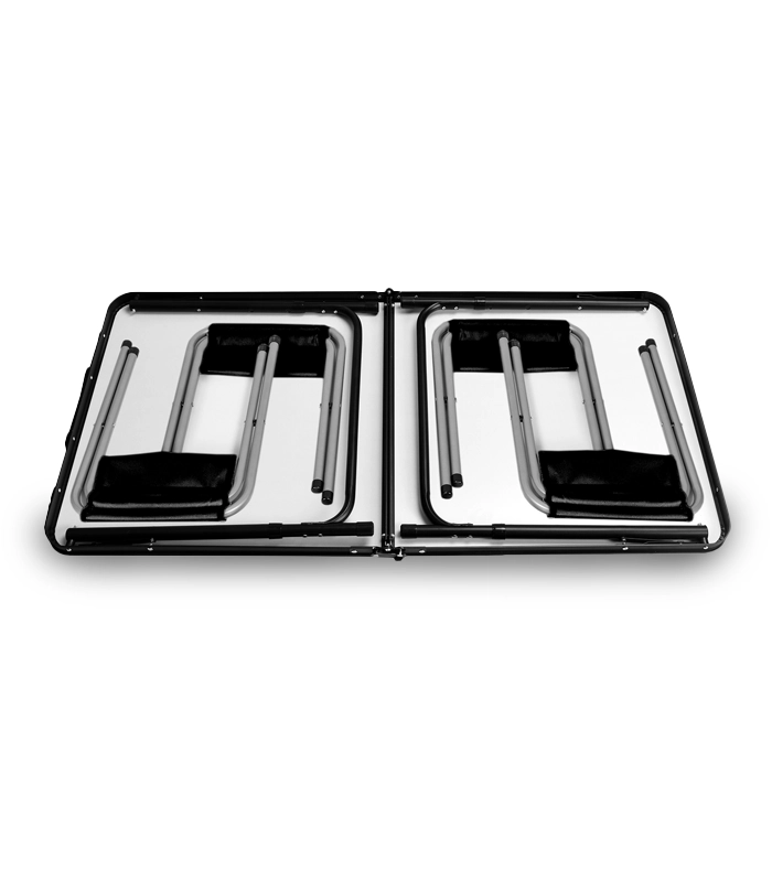 Ingevouwen verandert de hele set in een praktisch koffertje met handvat. Binnenin berg je de tafel en vier krukjes op – maximale ruimtebesparing in de auto en thuis.
