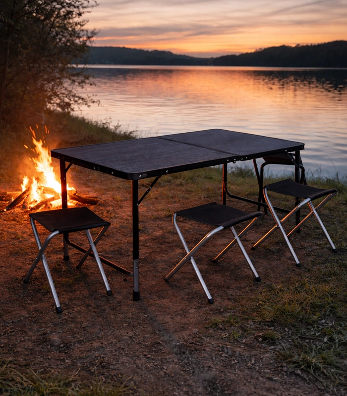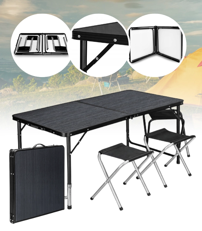 Praktische opvouwbare kampeerset met een ruime tafel en vier krukjes in een compacte koffer, ideaal voor kamperen, picknicks, in de tuin en om te vissen. Biedt snel opzetten, licht transport dankzij het handvat en verstelbare tafelhoogte voor maximaal comfort. De duurzame combinatie van een metalen frame en slijtvaste toplaag zorgt voor stabiliteit en een lange levensduur op elk terrein.