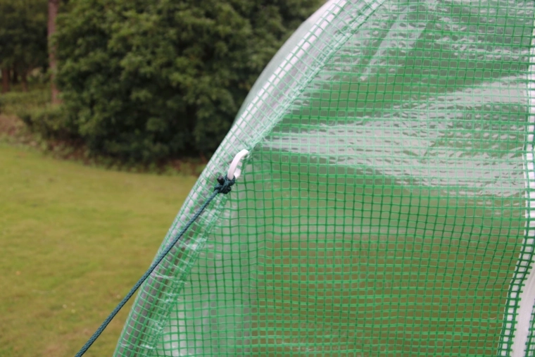 Het doordachte ventilatiesysteem met gaasramen zorgt voor frisse lucht en vermindert condensatie. De oprolbare ingang met rits biedt gemakkelijke toegang en betere luchtcirculatie tijdens het werk. Het verzinkte stalen frame geeft de hele constructie hoge duurzaamheid en een lange levensduur, terwijl de grondflap kan worden bedekt met aarde voor een stevige verankering.