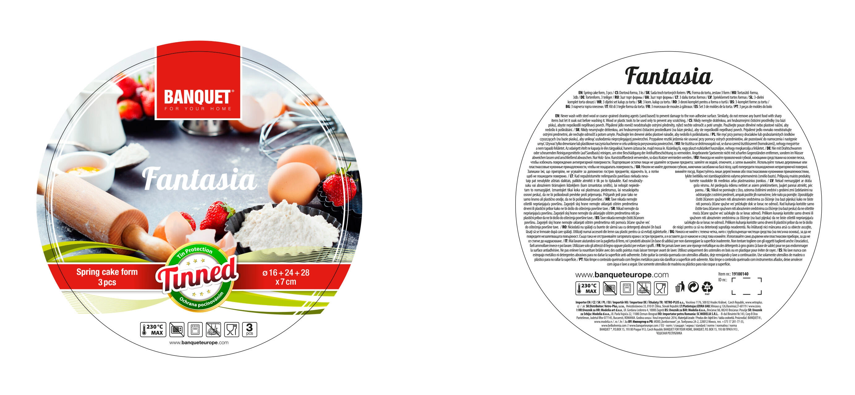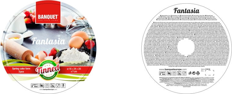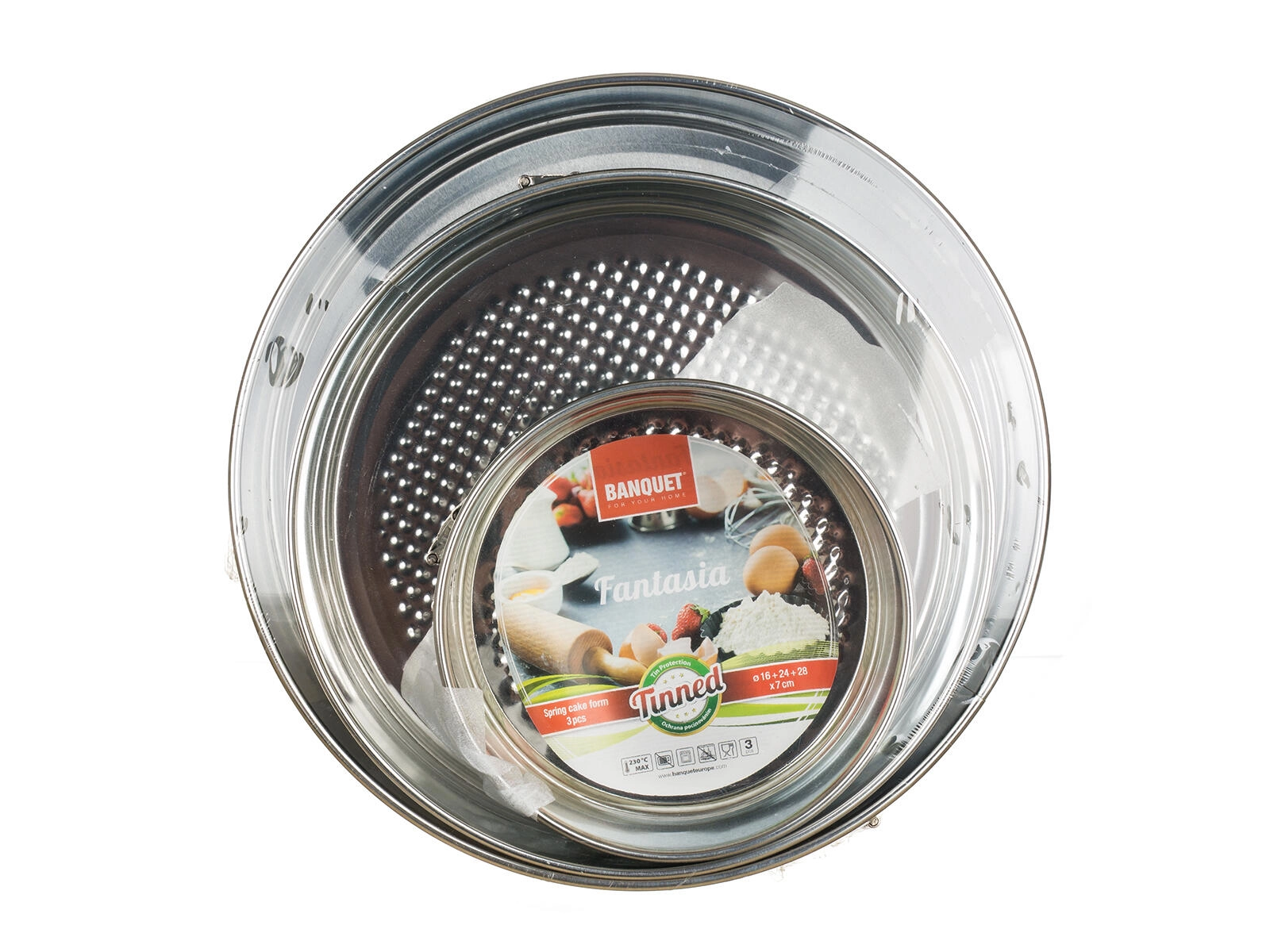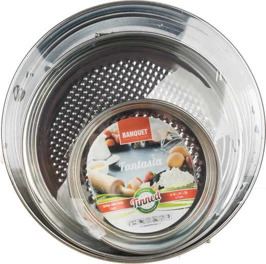Praktische set van drie springvormen FANTASIA met diameters van 16, 24 en 28 cm, gemaakt van vertind metaal met een hoogte van 7 cm. Ideaal voor het bakken van taarten en cheesecakes in elektrische, gas- en heteluchtovens. Het slijtvaste materiaal maakt het gebruik van metalen keukengerei mogelijk en vergemakkelijkt het uitnemen van bodems dankzij de zijsluiting.