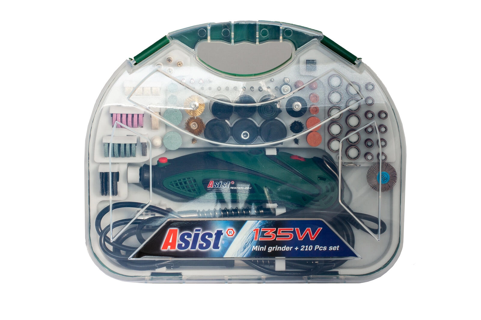 De set bevat 210-delig accessoires inclusief slijp-, snij-, boor- en polijstopzetstukken, plus een flexibele as voor fijn detailwerk en moeilijk bereikbare plaatsen. Alles is opgeborgen in een transparante koffer, zodat je altijd orde en snel overzicht hebt.