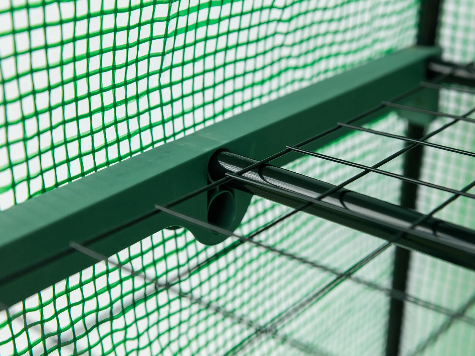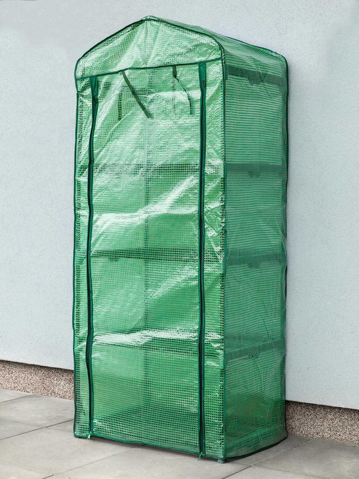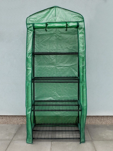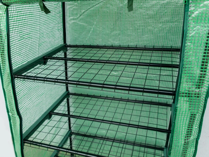 Vier draadrekken bieden georganiseerde, verticale ruimte voor zaailingen, kruiden en kleinere potplanten. Dankzij de slanke constructie past de foliekas ook op kleinere oppervlakken en helpt hij elke vierkante meter efficiënt te benutten.