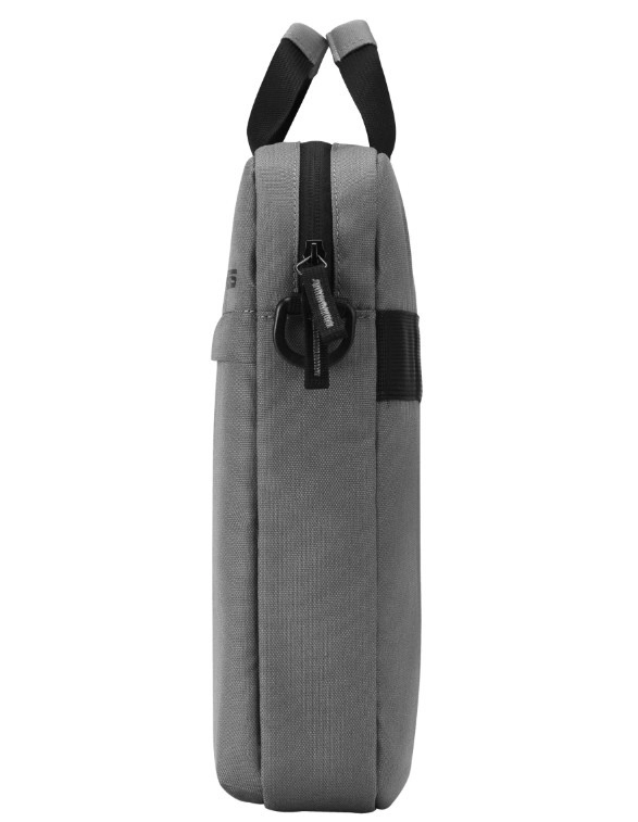 Glad en slijtvast materiaal met waterafstotende afwerking beschermt laptop en accessoires tegen weersinvloeden en dagelijkse slijtage.