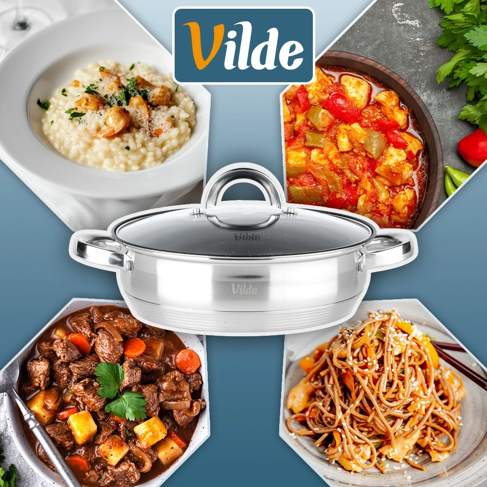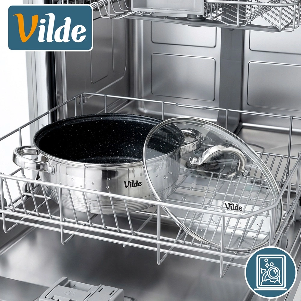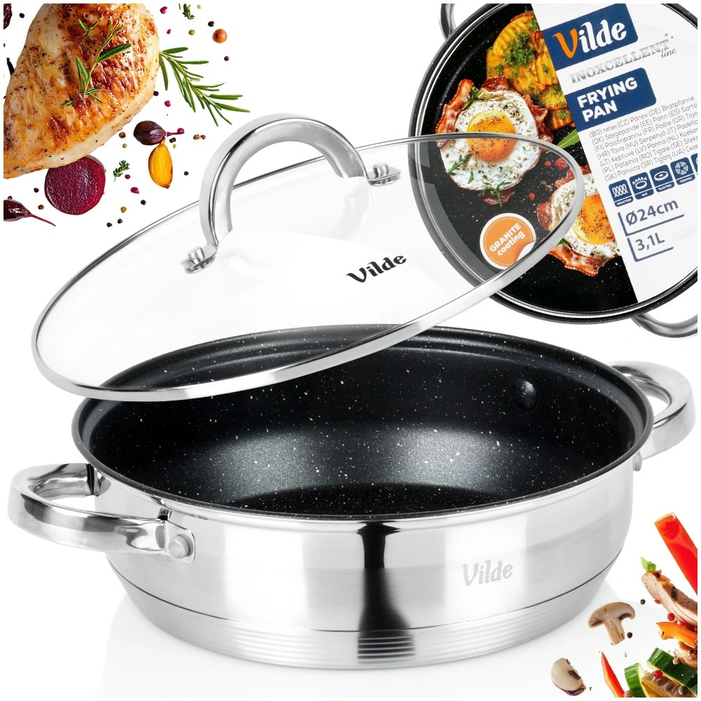De binnenzijde van de pan is voorzien van een duurzame antiaanbaklaag met granietlook, de buitenzijde combineert mat en hoogglans afwerking. Het product voldoet aan Europese kwaliteitsnormen. Origineel product van het merk Vilde uit de INOXCELLENT-lijn.