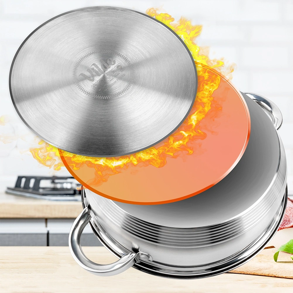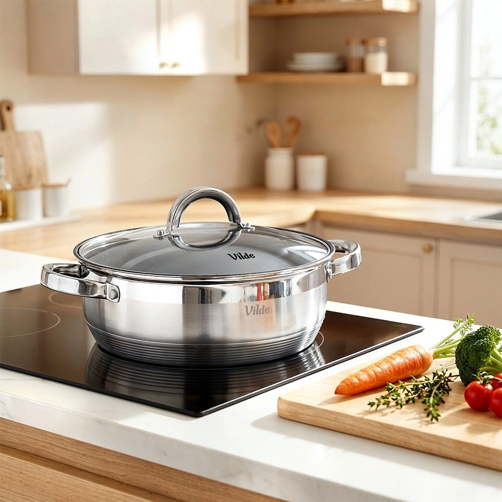 De meerlaagse, perfect vlakke bodem slaat warmte efficiënt op en verspreidt deze gelijkmatig. Bespaart energie en zorgt voor stabiele resultaten op alle kookplaten, inclusief inductie.