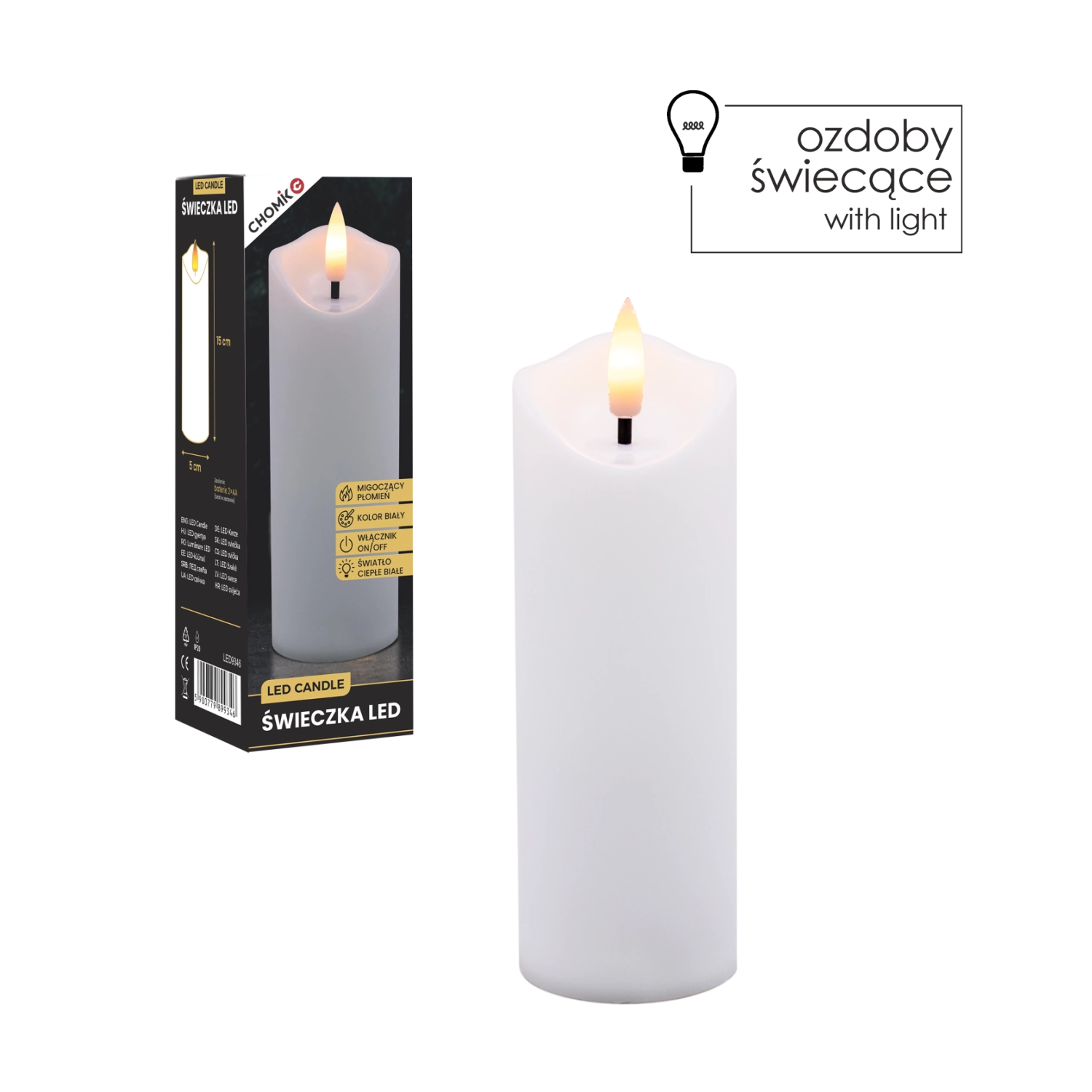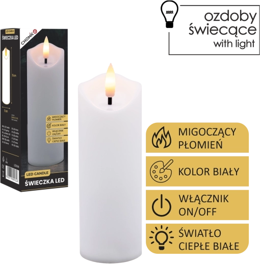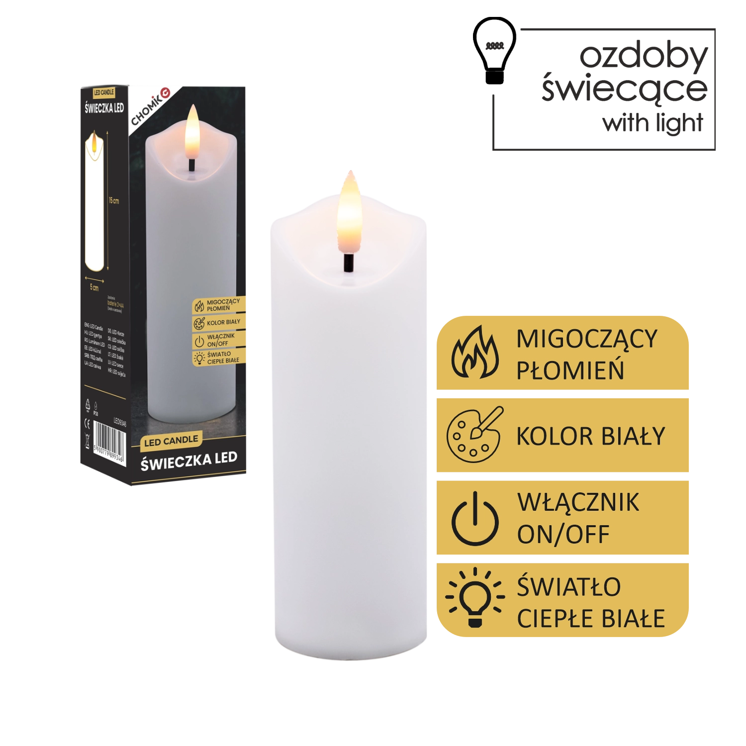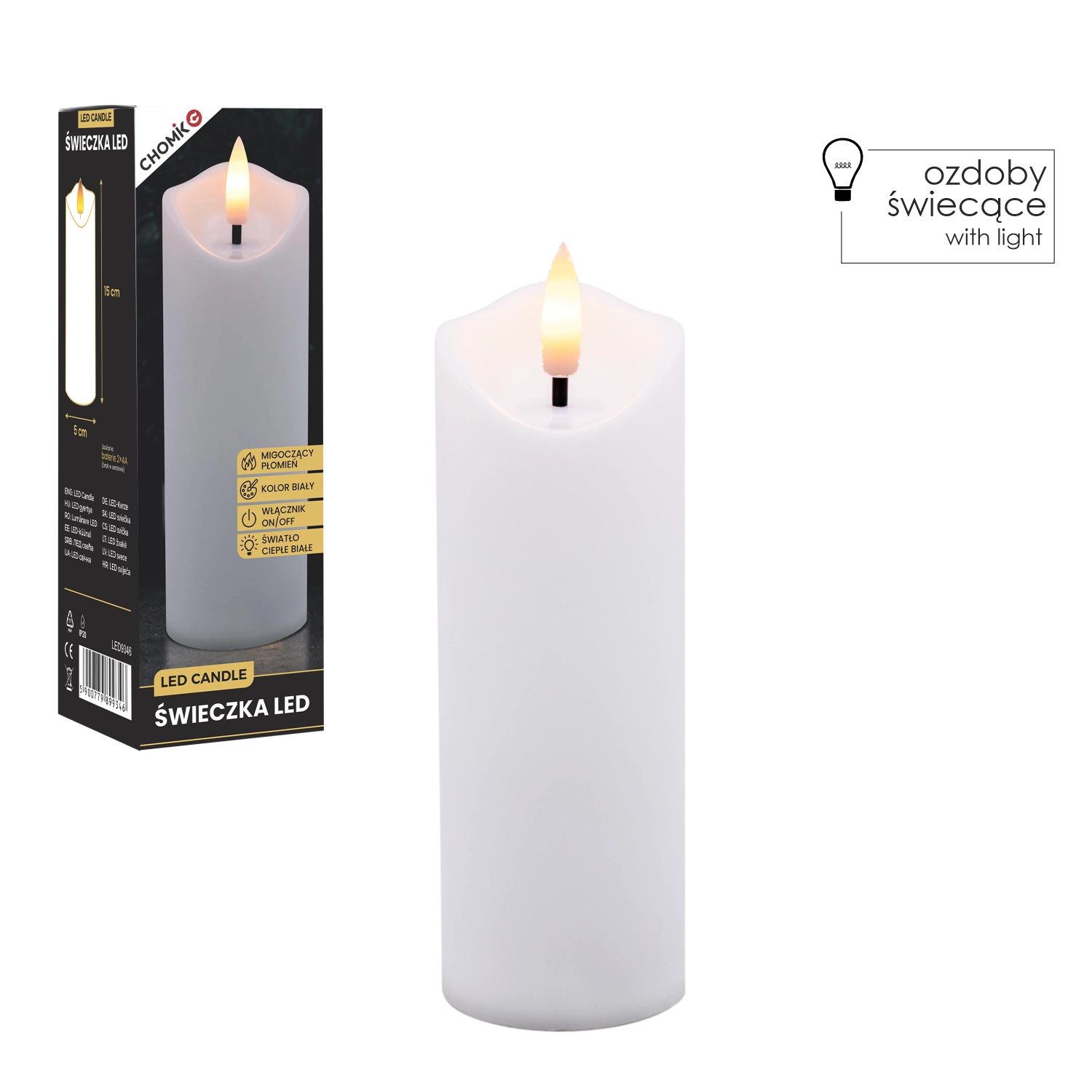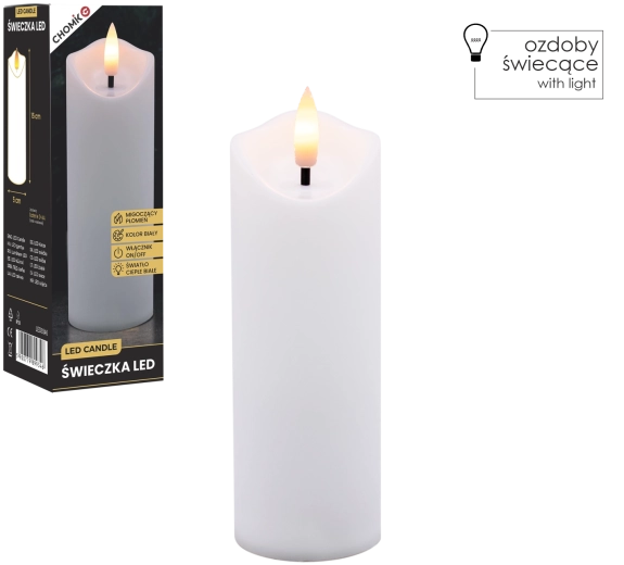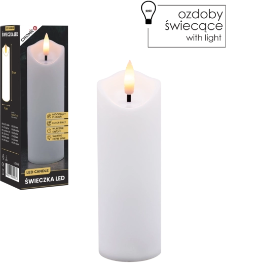 Veilige en praktische LED-kaars in elegant wit die een aangenaam warm licht met het effect van een echte vlam geeft. Ideaal voor de woonkamer, slaapkamer en als subtiele lichtdecoratie op tafel of plank. Kan ook worden gebruikt als vervanging voor een klassieke inzet voor lantaarn/znichu.