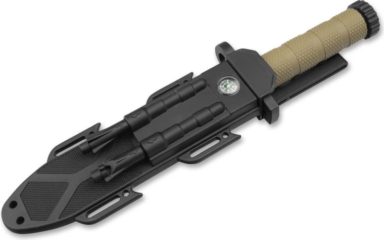 - Kunststof schede met kompas en vuurstarter, meerdere bevestigingsopties, geïntegreerde clip voor het dragen aan de riem