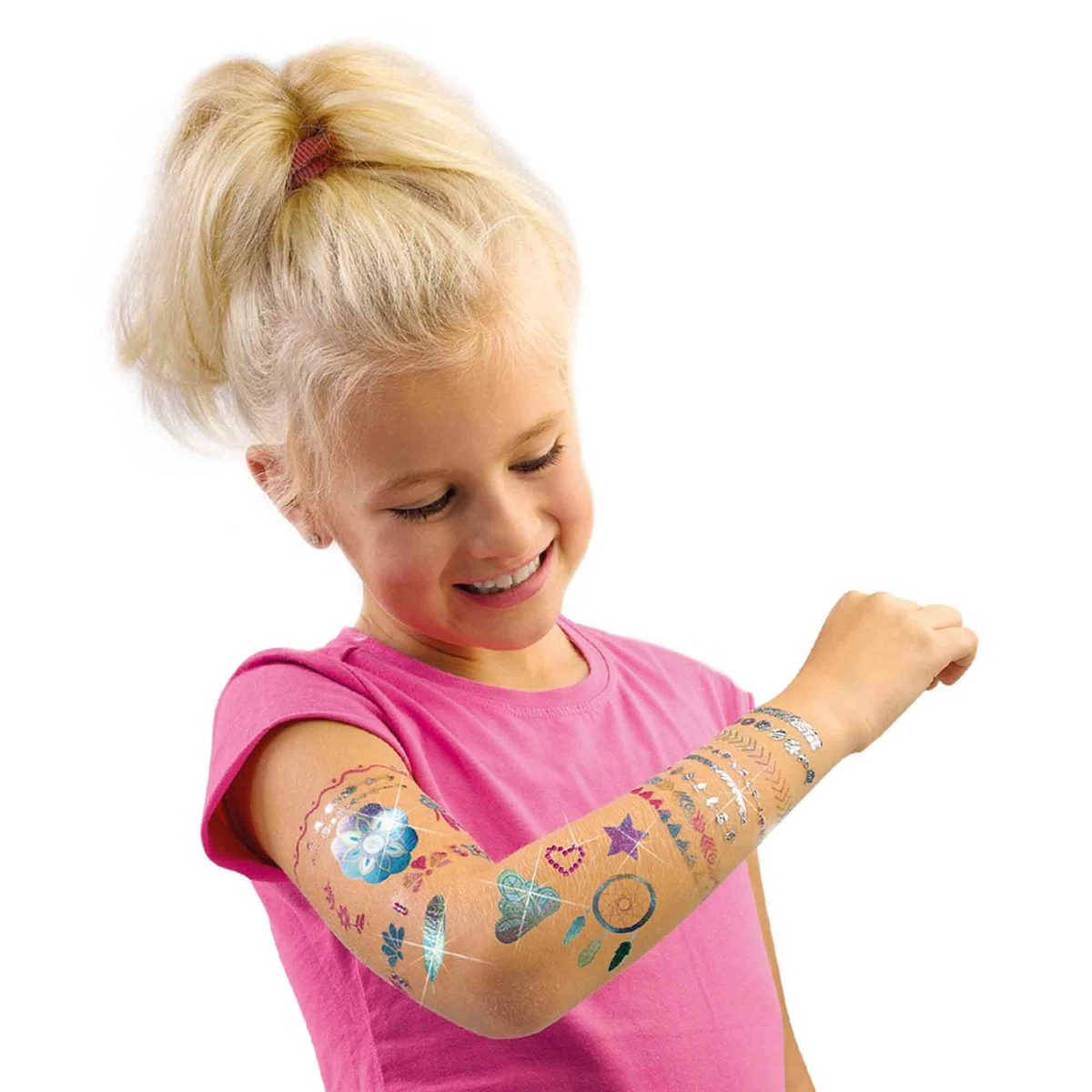 Creëer je eigen stijl met de luxe 3-in-1 tatoeageset, die metallic tijdelijke tatoeages combineert met transparante stickers om te bestrooien met glitters in 4 kleuren en huidlijm voor het schrijven van namen of het tekenen van je eigen motieven. Dankzij de diamanten steentjes geef je het resultaat extra glans en een feestelijke look.