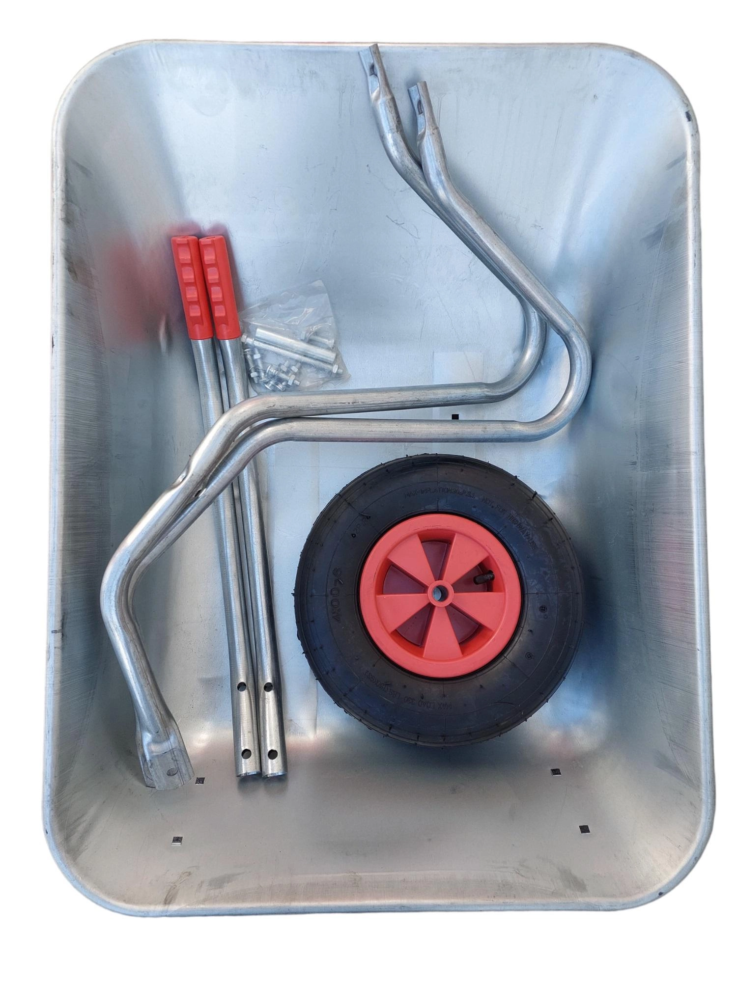 De kruiwagen wordt in een doos en ongemonteerd geleverd, waardoor hij gemakkelijk te vervoeren en op te slaan is. Eenvoudige montage zorgt ervoor dat u hem snel gebruiksklaar maakt. Ideale keuze voor het vervoeren van aarde, mulch, bouwmaterialen of tuinafval.
