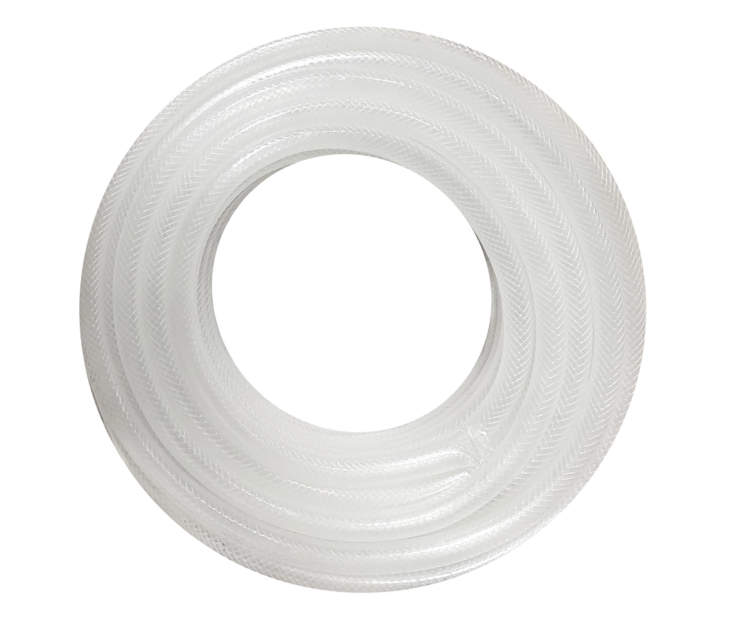 Deze transparante slang met witte tint is vervaardigd in een robuuste 3-laagse constructie voor dagelijks gebruik in de tuin. Dankzij de gevlochten polyesterversterking weerstaat hij een werkdruk van 6–10 bar (afhankelijk van de diameter) en biedt hij een betrouwbare doorstroming zonder knikken.