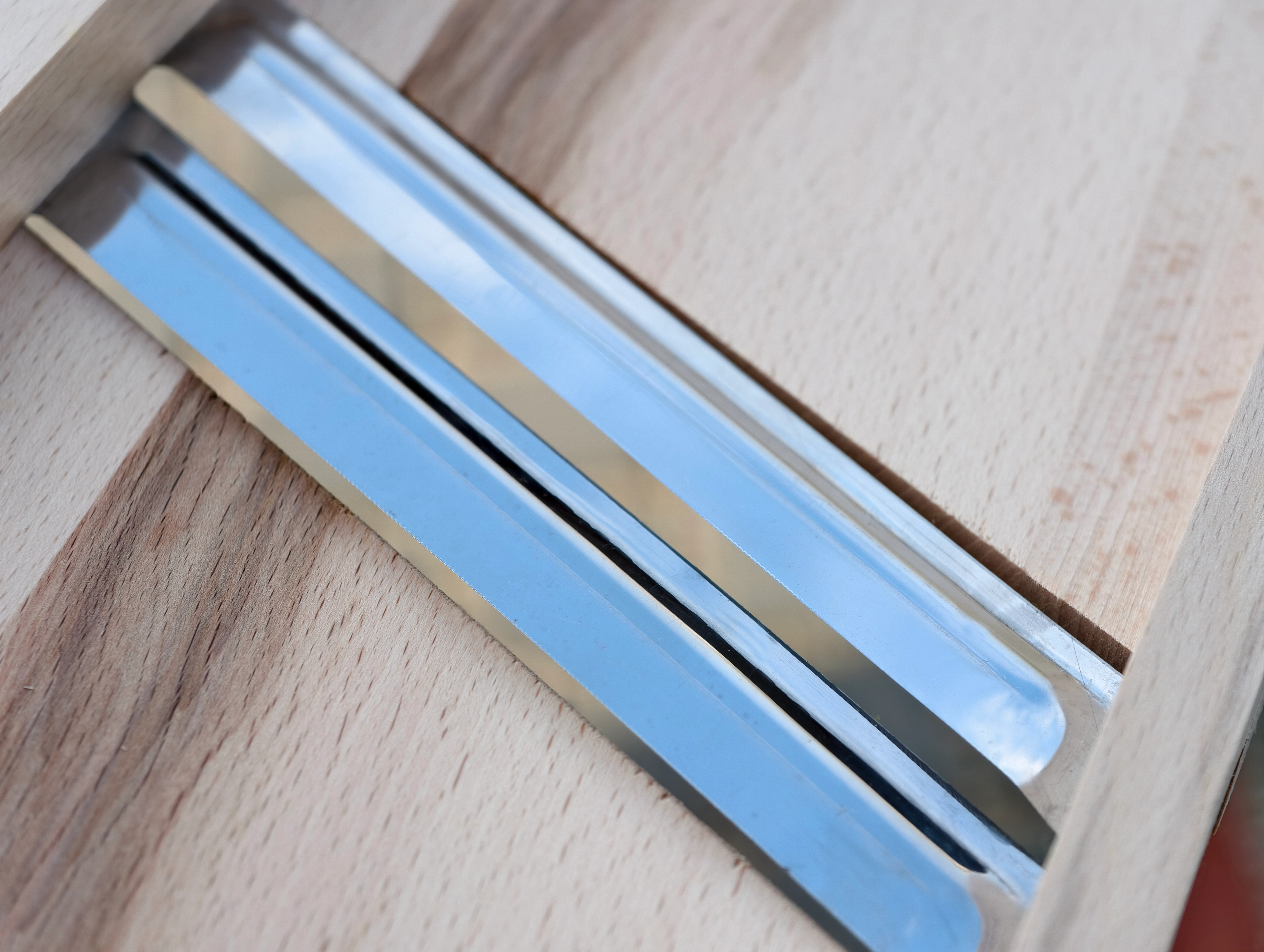 • 2 roestvrijstalen messen: scherp, vervangbaar, voor gelijkmatige plakjes.