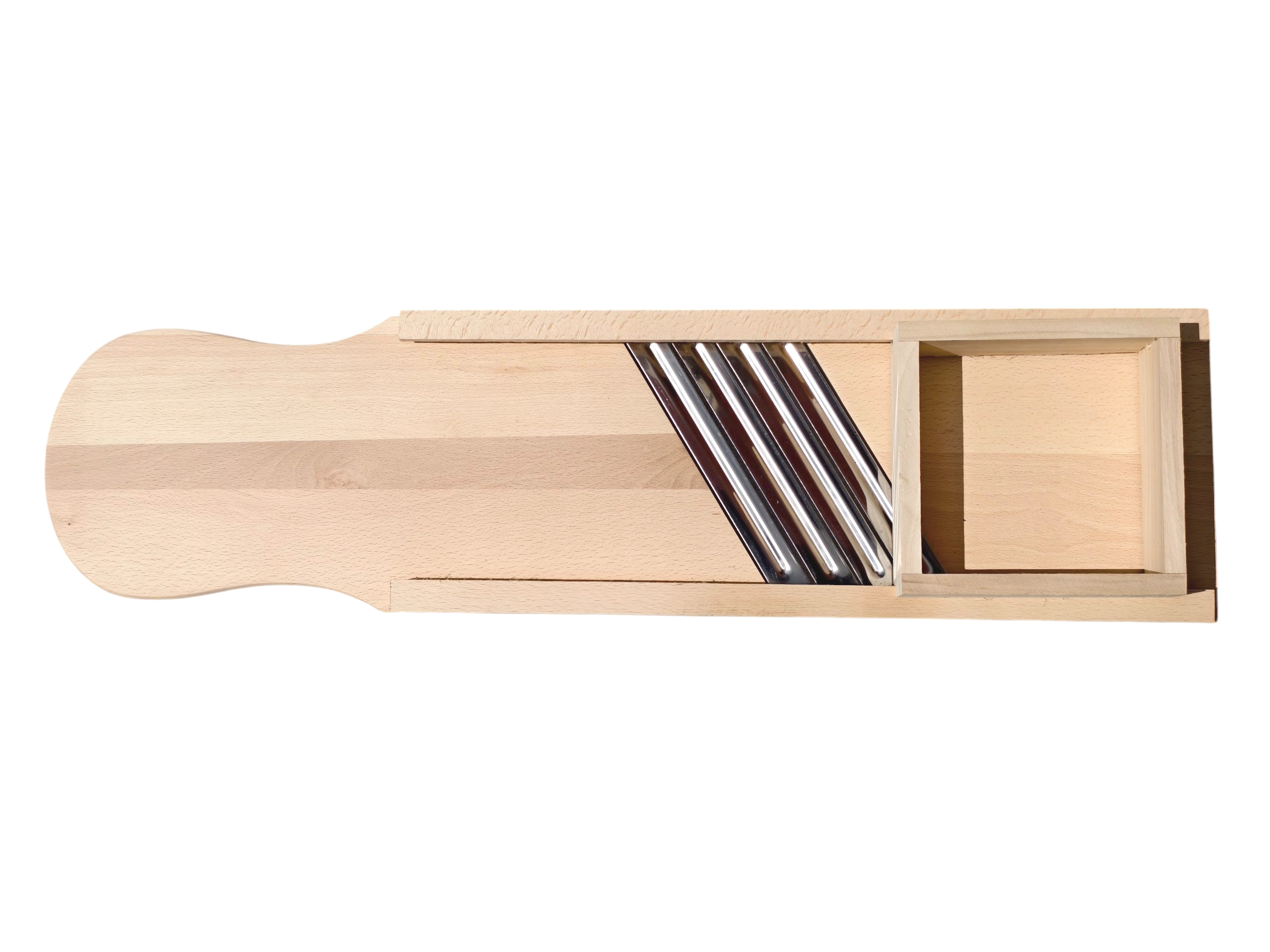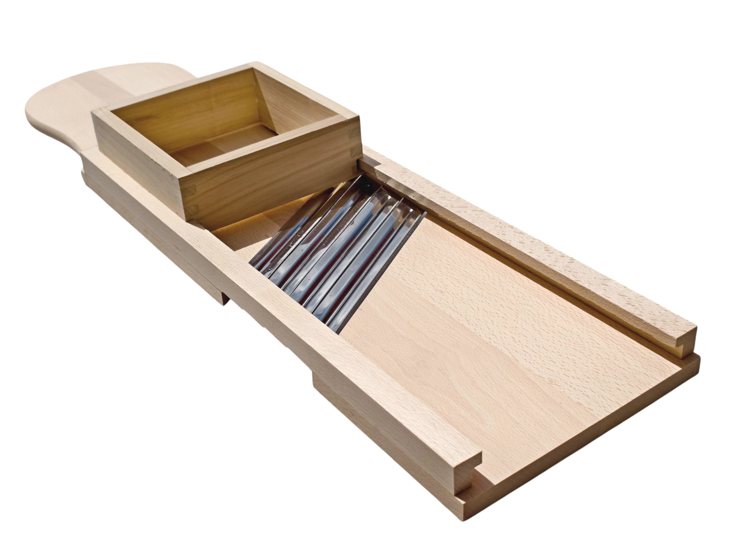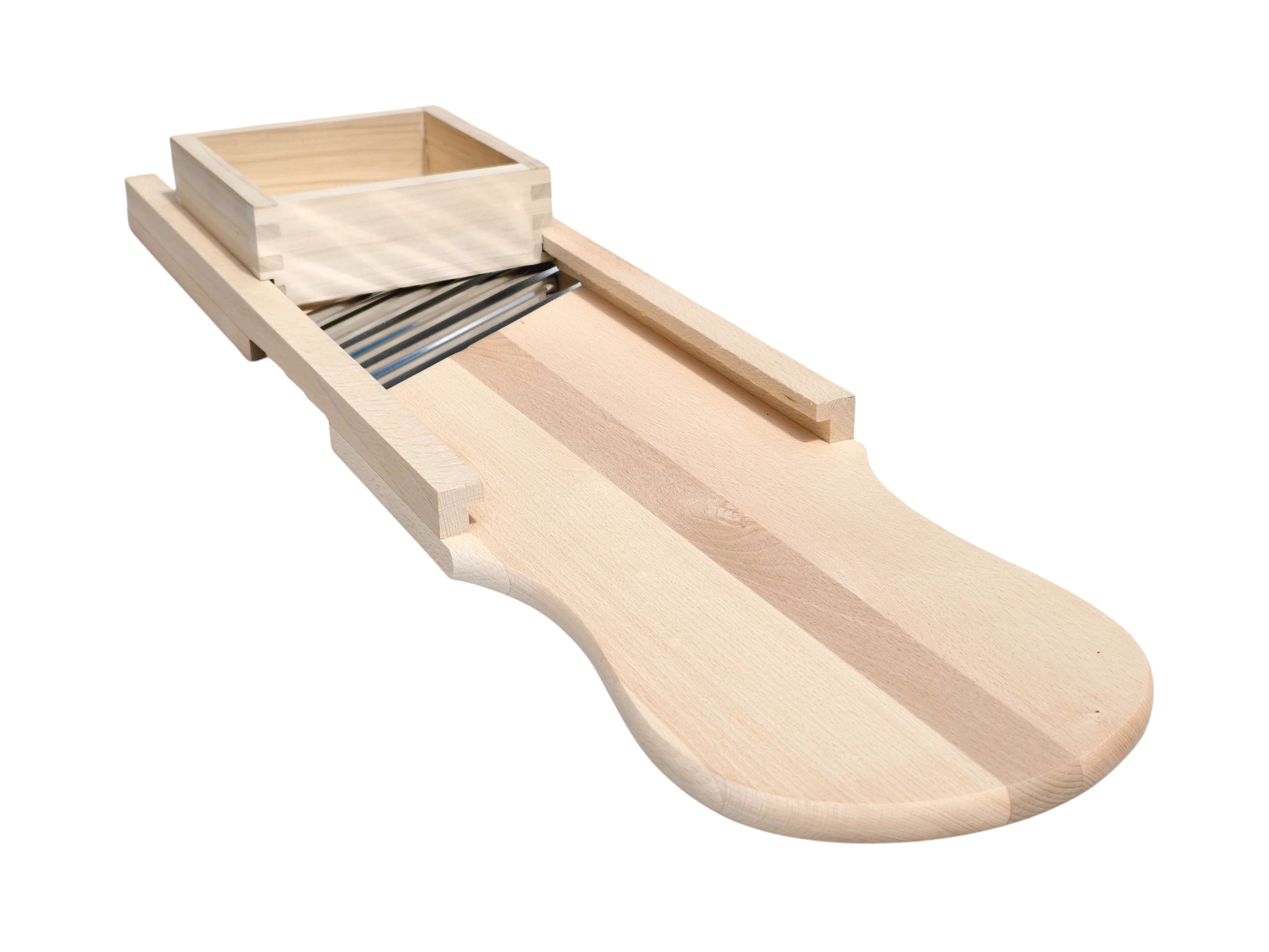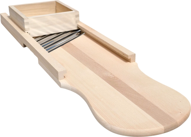 Ontdek de beproefde oplossing voor het bereiden van zelfgemaakte zuurkool, salades en pickles. Deze grote houten snijder is gemaakt van massief natuurlijk hout, dat hygiënisch en uitzonderlijk sterk is. Vier scherpe roestvrijstalen messen zorgen voor vloeiend en precies snijden met gelijkmatige plakken, terwijl de geïntegreerde schuiflade/geleidebox de grondstof veilig leidt en de vingers tijdens het werk beschermt.
