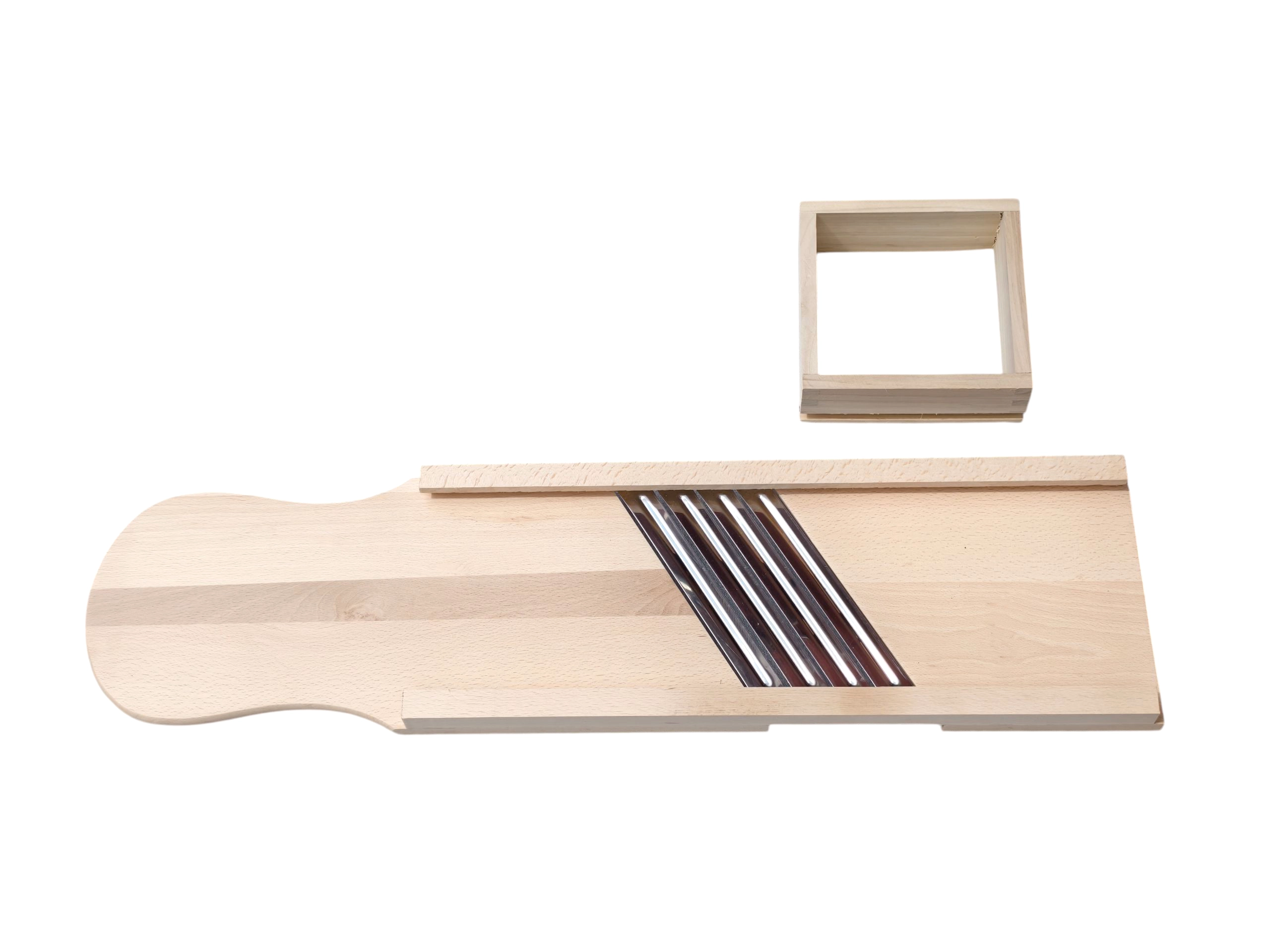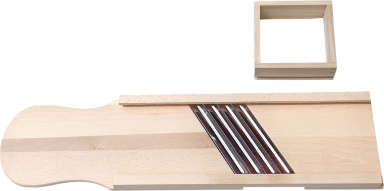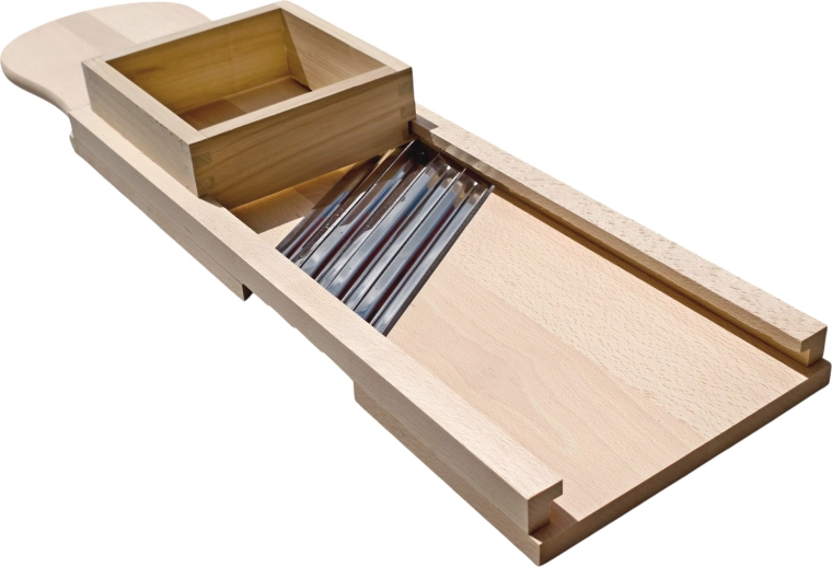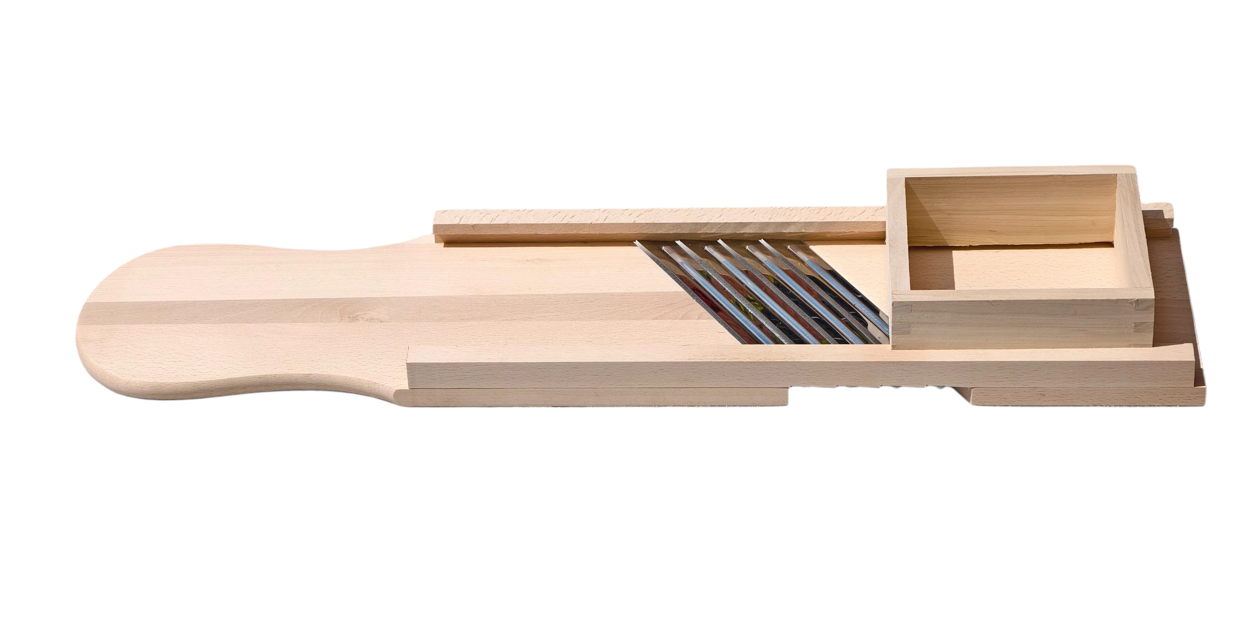 Ontdek de beproefde oplossing voor het bereiden van zelfgemaakte zuurkool, salades en pickles. Deze grote houten snijder is gemaakt van massief natuurlijk hout, dat hygiënisch en uitzonderlijk sterk is. Vier scherpe roestvrijstalen messen zorgen voor vloeiend en precies snijden met gelijkmatige plakken, terwijl de geïntegreerde schuiflade/geleidebox de grondstof veilig leidt en de vingers tijdens het werk beschermt.