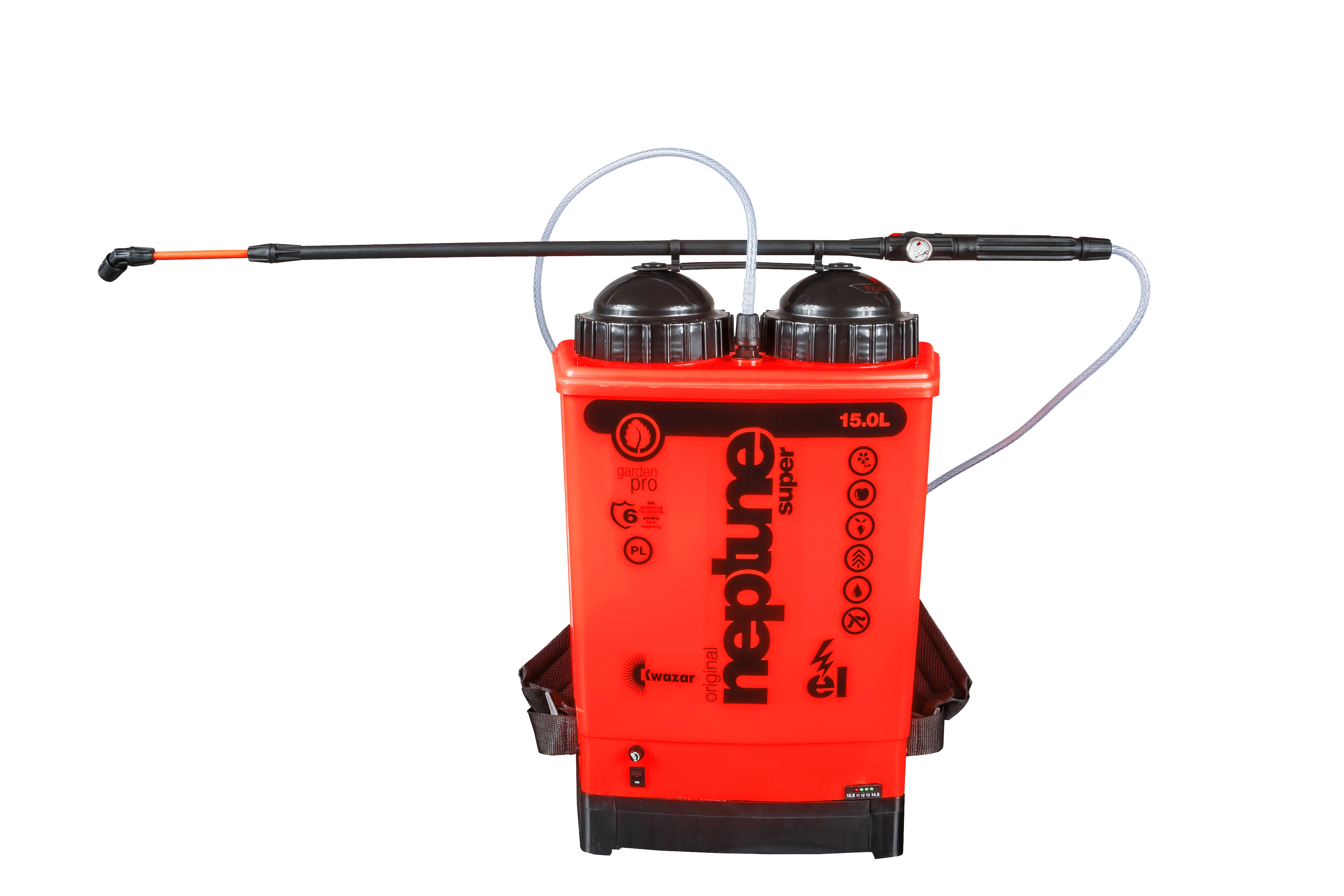 NEPTUN GARDEN 15 l is een professionele rugspuit aangedreven door een 12V gel-accu, die zorgt voor een gelijkmatige en precieze verneveling zonder inspanning. Het afzonderlijke drukreservoir in de tank houdt een stabiele druk aan, terwijl de drie-traps filtratie de pomp en sproeiers tegen verontreinigingen beschermt. De peilindicator op de tank maakt nauwkeurige meting van het niveau en het volume van de sproeistof mogelijk.