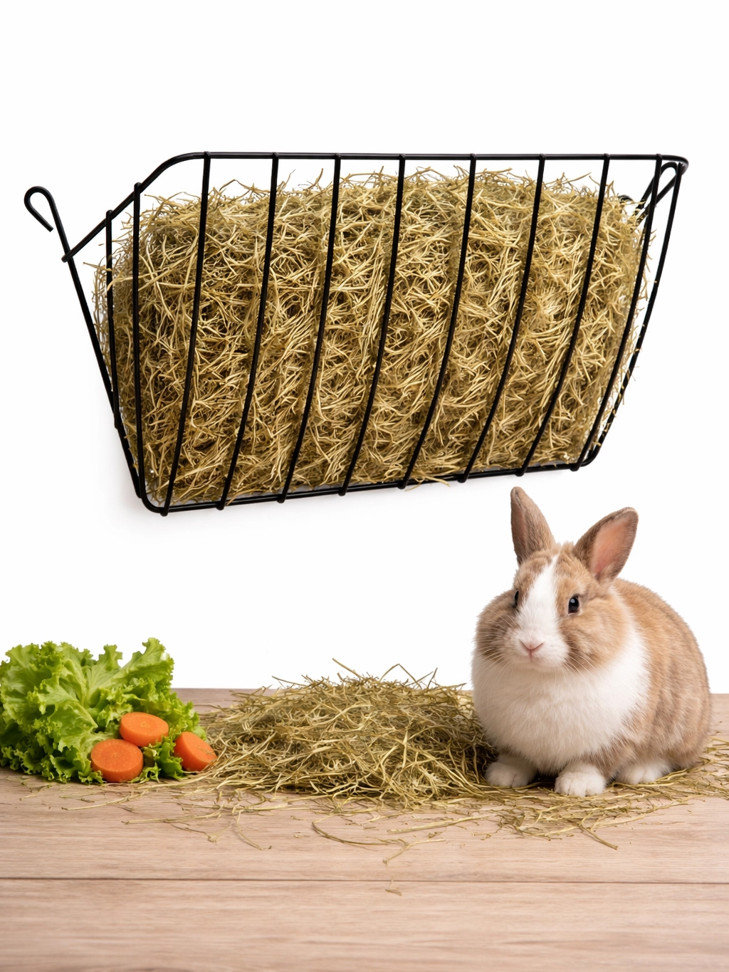 Grote hooiruif voor konijnen met praktische bovenlading voor een schone en hygiënische verstrekking van hooi. De open draadconstructie biedt dieren gemakkelijke toegang, terwijl het hooi boven het strooisel blijft en niet wordt verspild.