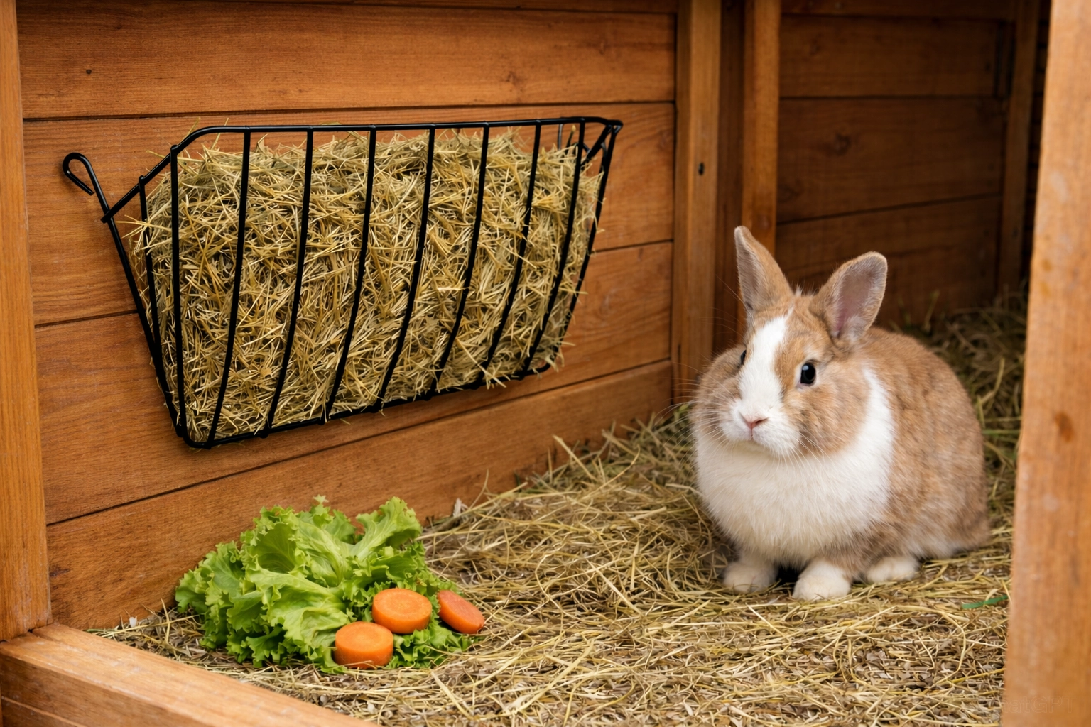 Vul de ruif van bovenaf en houd het hooi boven het strooisel – minder verspilling, meer netheid en betere hygiëne in het konijnenhok.
