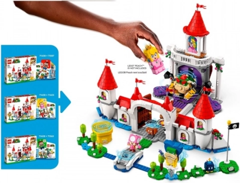 Betreed het koninkrijk van PRINCESS PEACH met het rijk gedetailleerde kasteelmodel dat je LEGO Super Mario banen uitbreidt. Je vindt er een troonzaal met draaibare muur waarachter Bowser verscholen zit, een glas-in-loodraam met Peach, een geheime schilderij met actiemarker en een taart met Goomba. Verder zijn er een speciale kasteelpijp, een tijdbox, een lavabrug en een schaal met paars fruit.