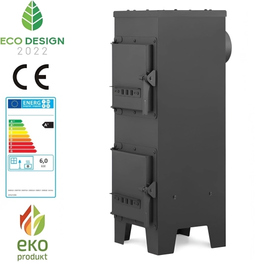 De bediening is gebruiksvriendelijk: instelling van de verbrandingssnelheid maakt vermogensregeling mogelijk, de uitneembare aslade vereenvoudigt het reinigen en de standaard rookgasafvoer Ø 120 mm vergemakkelijkt de aansluiting op de schoorsteen. De kachel voldoet aan de norm EN 13240:2008 (CE) en aan de eisen van Ecodesign 2022, waardoor dit een geschikte keuze is voor huisverwarming met hout en houtbriketten.