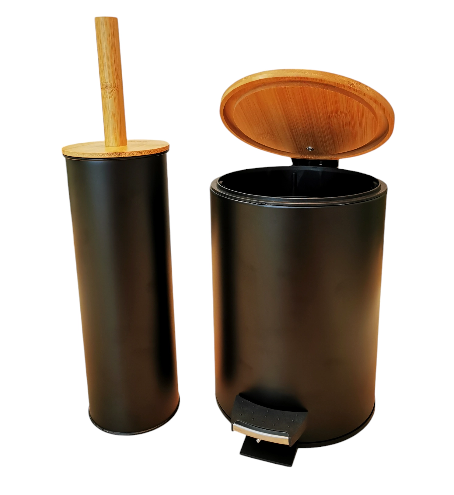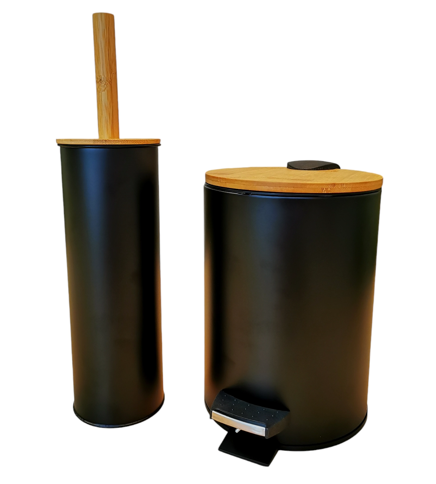 Een elegante en functionele badkamer set die design, hygiëne en comfort verenigt. De pedaalemmer van 3 liter heeft pedaalbediening en een Soft Close-demping, waardoor hij niet klapt en het deksel niet beschadigt. De uitneembare binnenemmer maakt legen en reinigen eenvoudig. De bijpassende wc-borstel met houder in matzwart met bamboeaccenten completeert de uniforme look van de badkamer.