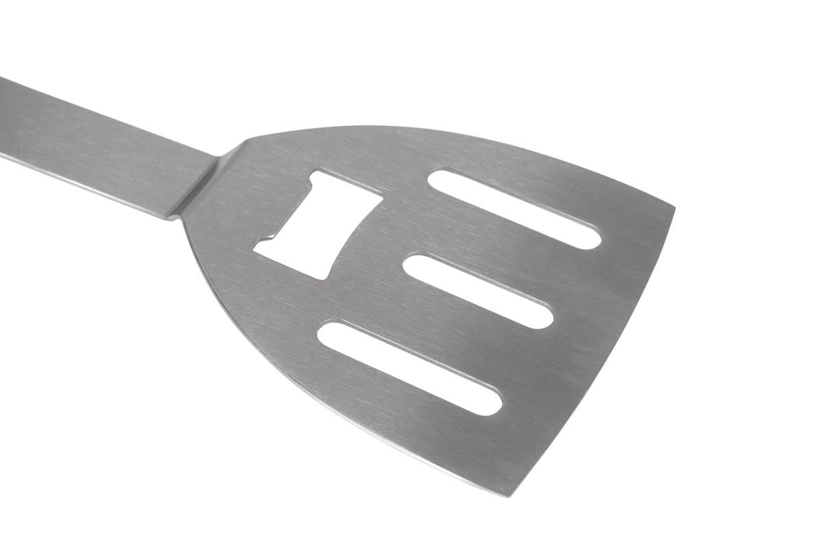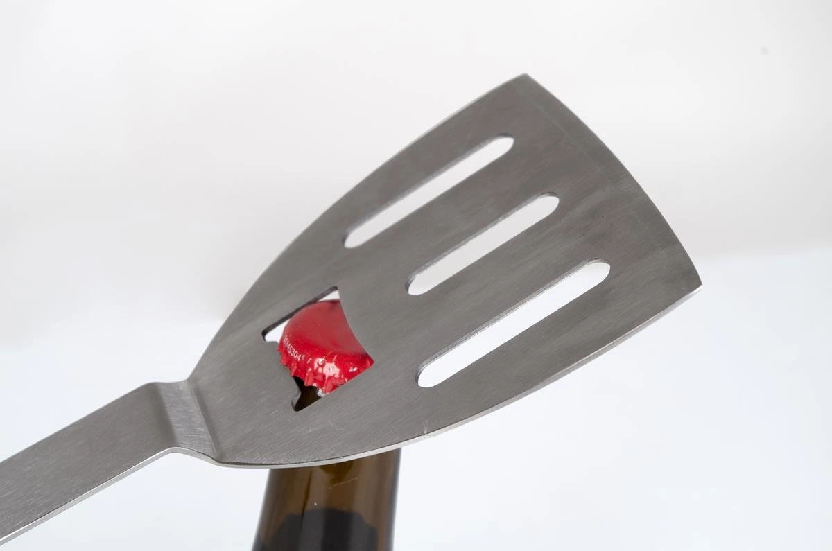 De sleuven in het blad helpen vet af te voeren en de geïntegreerde flesopener komt altijd van pas tijdens het grillen.