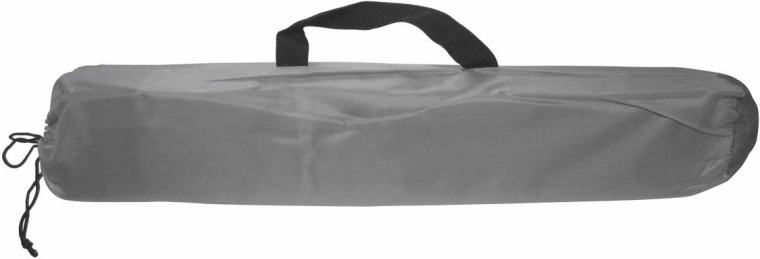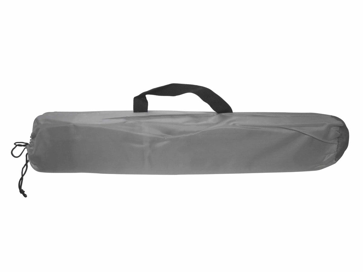 Het windscherm vouwt compact op in een tas met handvat. Haringen en scheerlijnen zijn inbegrepen voor directe verankering.