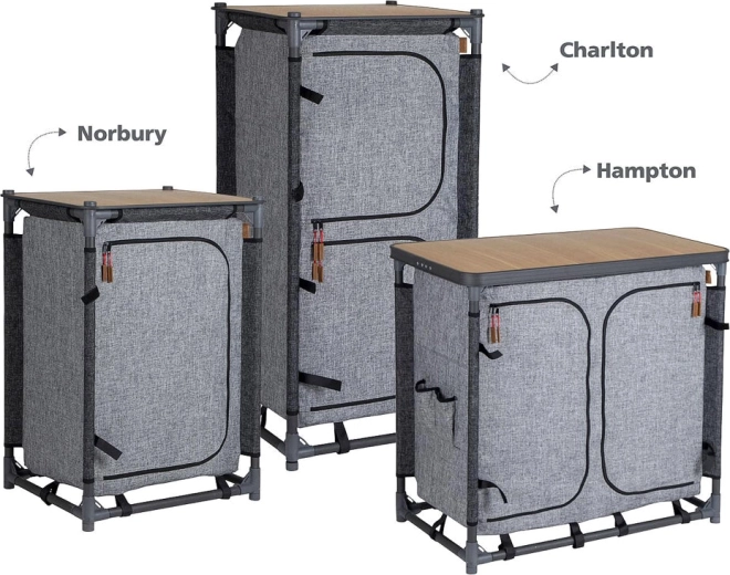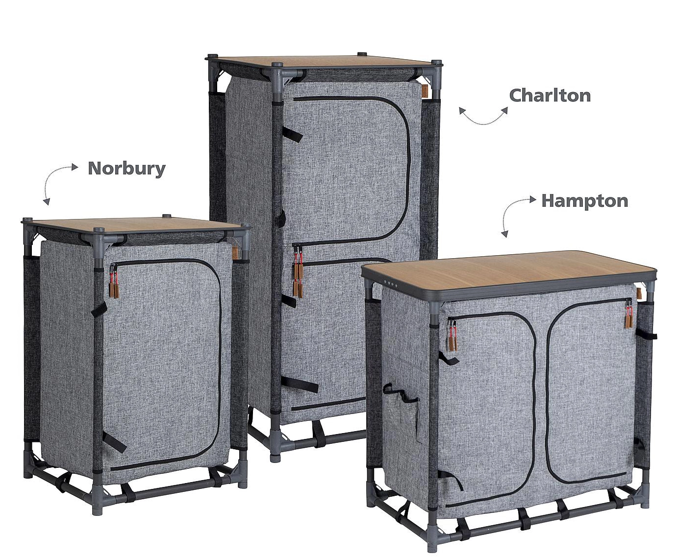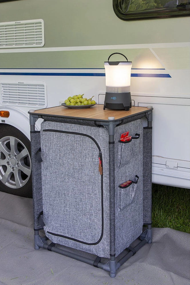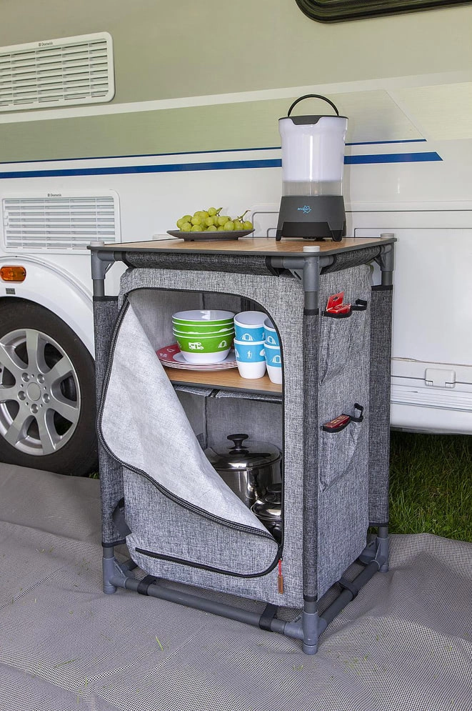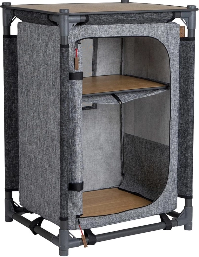 Praktische en stijlvolle kast voor kamperen en thuis, met voldoende opbergruimte, snel op te zetten en een stabiele constructie. Dankzij het aluminium frame, het duurzame MDF-blad met houtlook en de Oxford polyester bekleding is hij ideaal voor de camping, caravan en kleine woning. Verstelbare poten zorgen voor stabiliteit op oneffen terrein en de draagtas maakt transport eenvoudig.