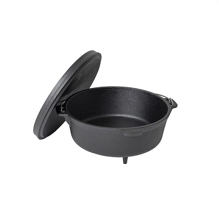 Traditionele gietijzeren ketel met een inhoud van 5 liter voor koken boven open vuur en op het fornuis. Massief gietijzer zorgt voor een gelijkmatige warmteverdeling, het binnenoppervlak heeft een anti-aanbak- en anticorrosielaag voor eenvoudig onderhoud. Drie stabiele pootjes en een praktische beugel om op te hangen vergroten de gebruiksmogelijkheden tijdens het kamperen, in de tuin en bij een picknick.